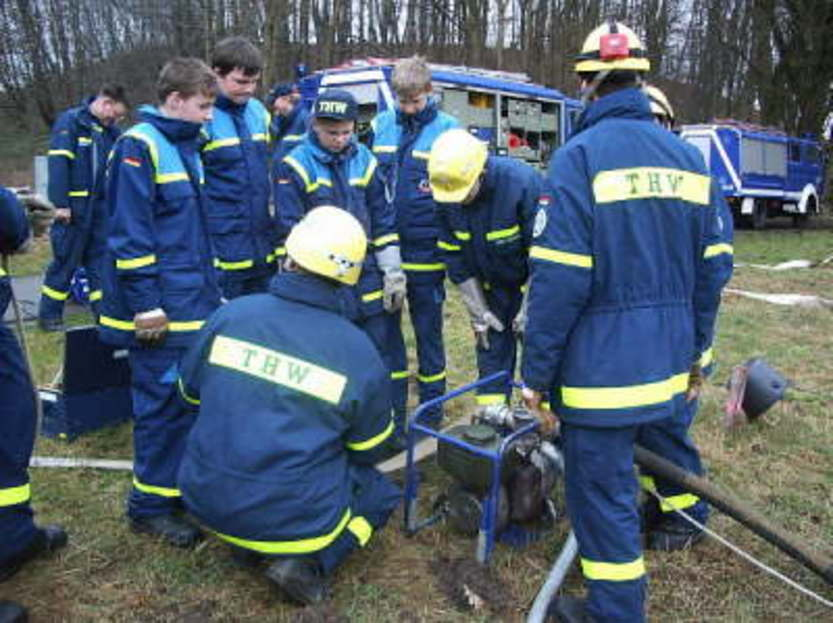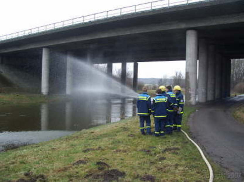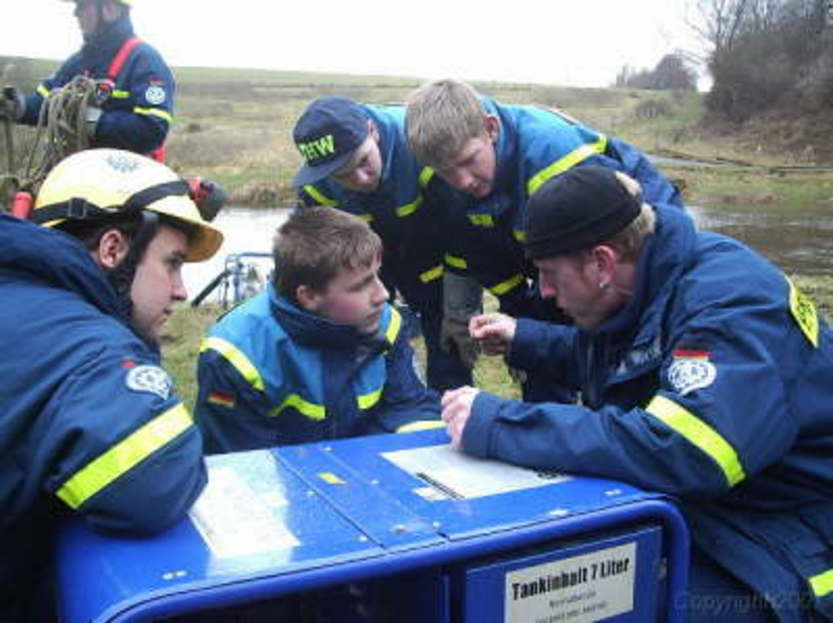 Am 04.01.2006 fuhren wir mit den Aktiven Helfen zur Trave um eine größere Ausbildungseinheit, die den ganzen Tag dauerte, zu machen. Zuerst stand Ausbildung am 8kva Stromerzeugen auf dem Programm. Im Anschluss daran haben wir dann mit Tauch- und Schmutzwasserkreiselpumpen weitergemacht. Nach einer Mittagspause ging es dann weiter. Uns wurde gezeigt wie man eine PSA anlegt , damit wir uns an der Autobahnbrücke hochziehen konnten. Natürlich wurden wir ausreichend dabei gesichert durch ein 2. Seil, das auch an der PSA befestigt wurde. Nach diesem Highlight ging es dann langsam und in Ruhe wieder an das Abbauen und Einpacken der Geräte.