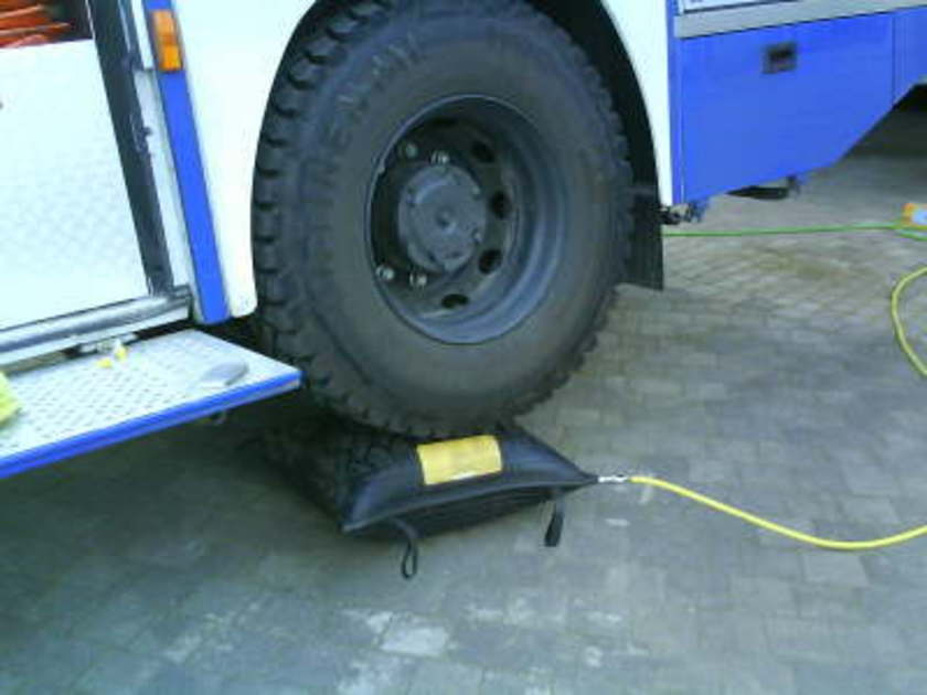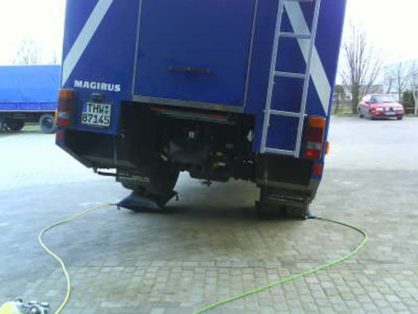 An diesen Mittwoch haben mit Hilfe der Hebekissen unseren GKW I angehoben. Grundsätzlich zu beachten ist, dass man mit die Hebekissen nur den unbeweglichen Achsen des Fahrzeuges einsetzt. Außerdem erfolg der Aufbau vom Verbraucher zum Erzeuger. Damit das Fahrzeug, was angehoben wird, nicht wegrutscht wird einer der Vorderreifen in beide Richtungen verkeilt.
