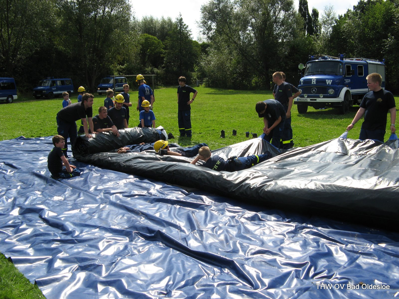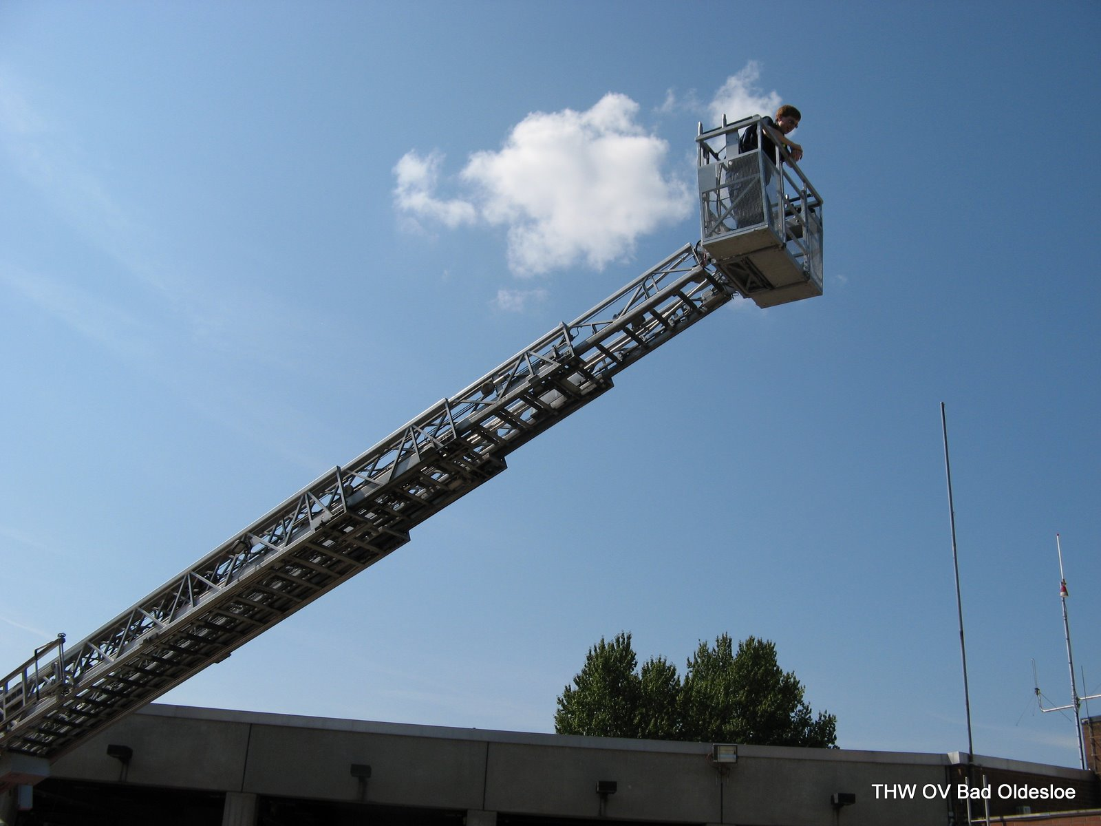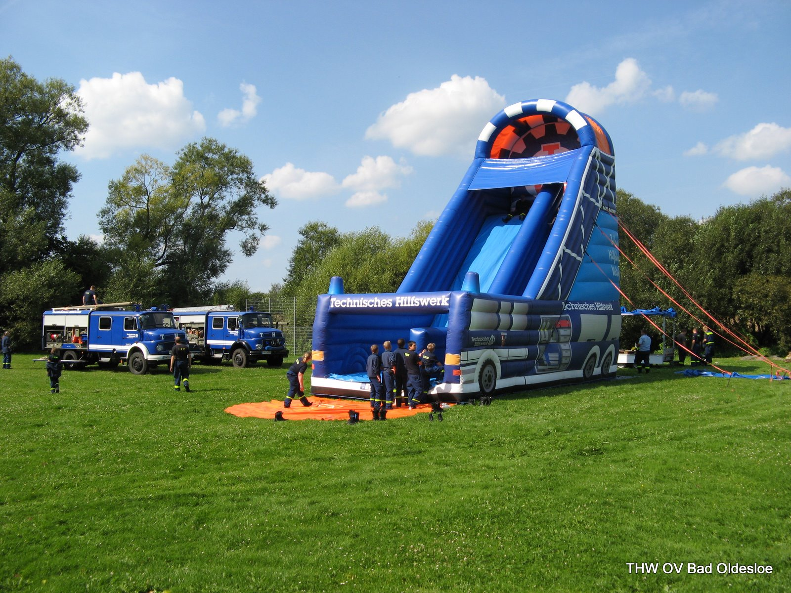 Die Fachgruppe Beleuchtung tauschte gegen Mittag ihr Beleuchtungsmaterial gegen die Riesenrutsche des THW-Länderverbandes, welche seit einigen Monaten in Ahrensburg stationiert ist. Auf der Familienwiese im Stadtteil Gartenholz baute die Fachgruppe die Rutsche zur Überraschung der übrigen Helfer auf. Dort rutschten nicht nur die Teilnehmer der 23-Stunden-Übung, sondern auch einige Kameraden der Ahrensburger Feuerwehr, welche ihre Drehleiter zuvor netterweise für ein Gruppenfoto zur Verfügung gestellt hatten.
