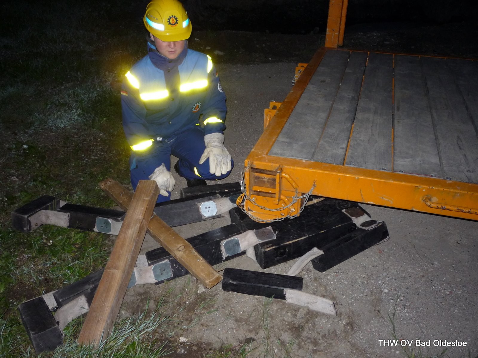Kaum zurück in der Unterkunft, gab es für zwei der Bergungsgruppen und die Beleuchtung um kurz nach 23 Uhr schon den nächsten Einsatz. Auf dem Hof der Karl Petersen Bauausführungen GmbH in Ahrensburg waren zwei Personen beim Spielen verunfallt. Im Licht der Fachgruppe Beleuchtung suchten die beiden Bergungsgruppen die beiden Übungspuppen. Eine Übungspuppe lag eingeklemmt unter einem Anhänger. Mit einem Hebekissen wurde der Anhänger angehoben und die Puppe so befreit. Um an die zweite Puppe heranzukommen, mussten zunächst Palettenstapel abgetragen werden.