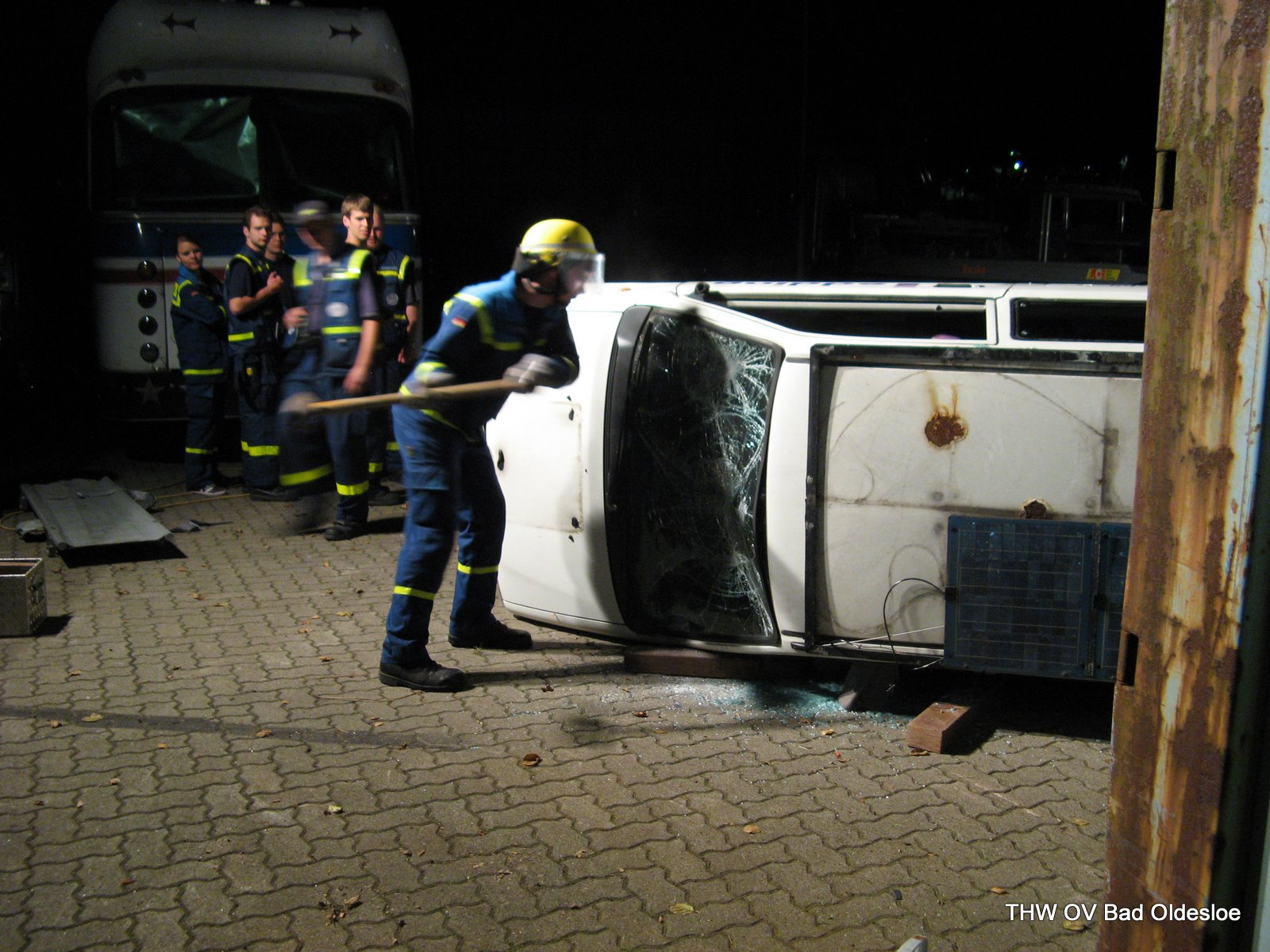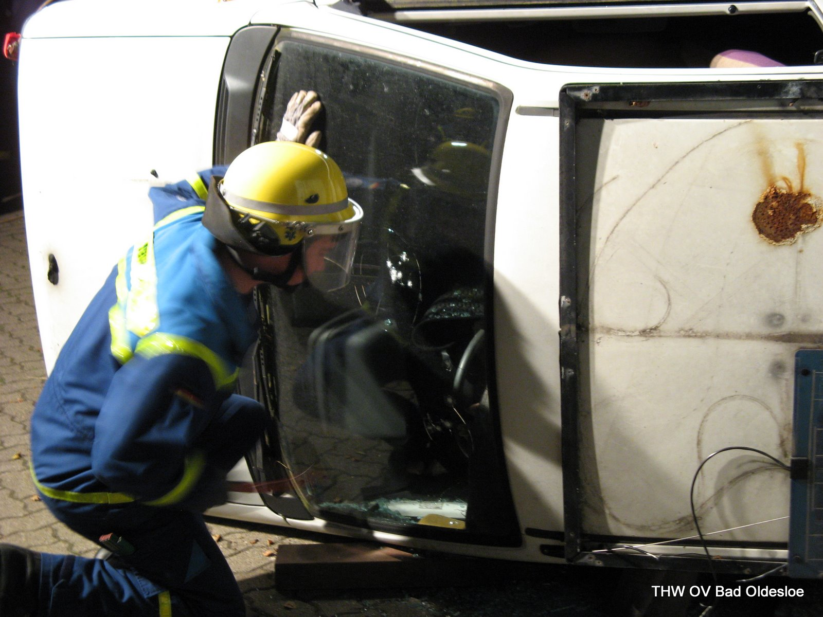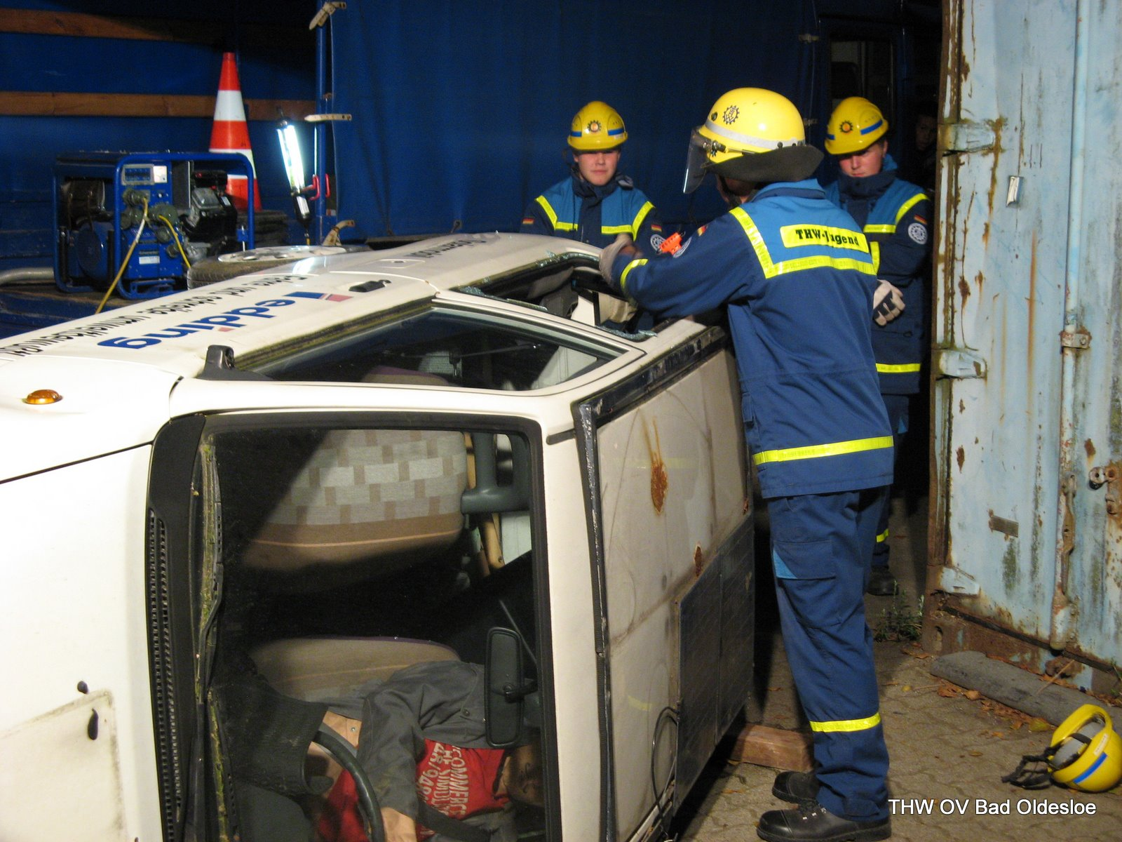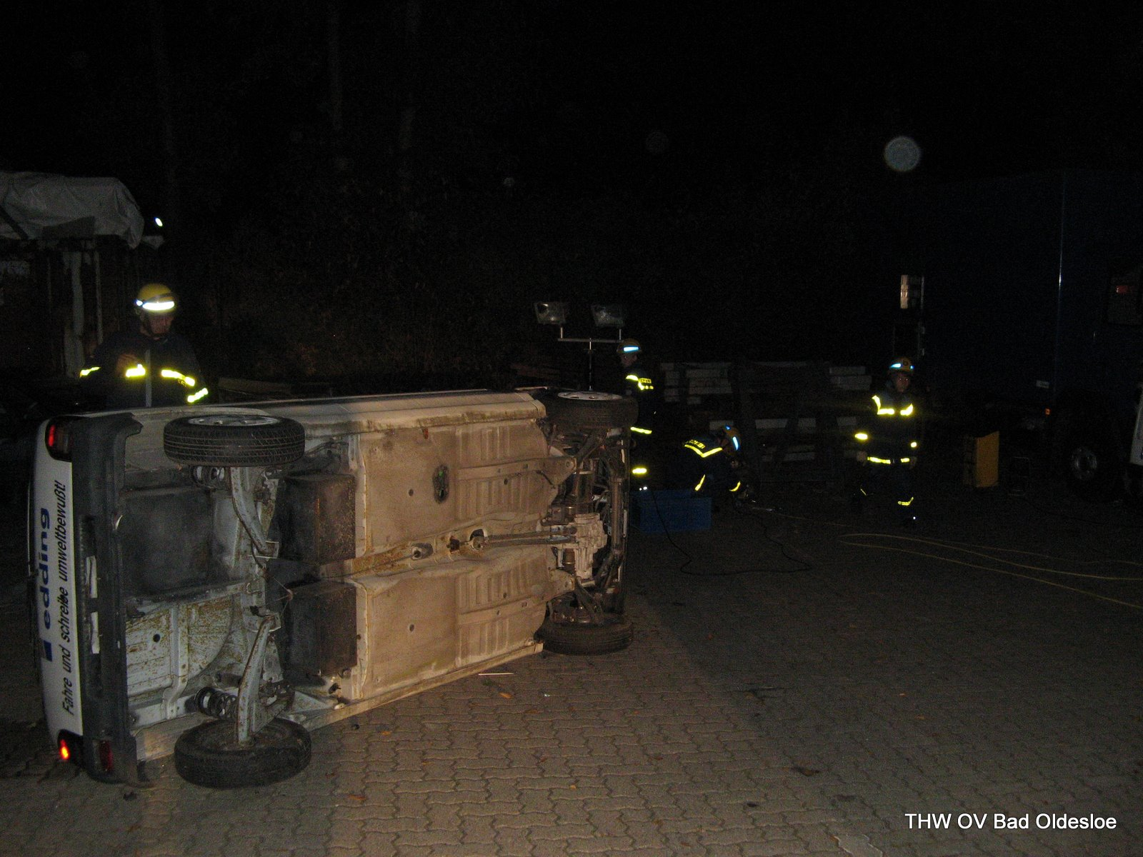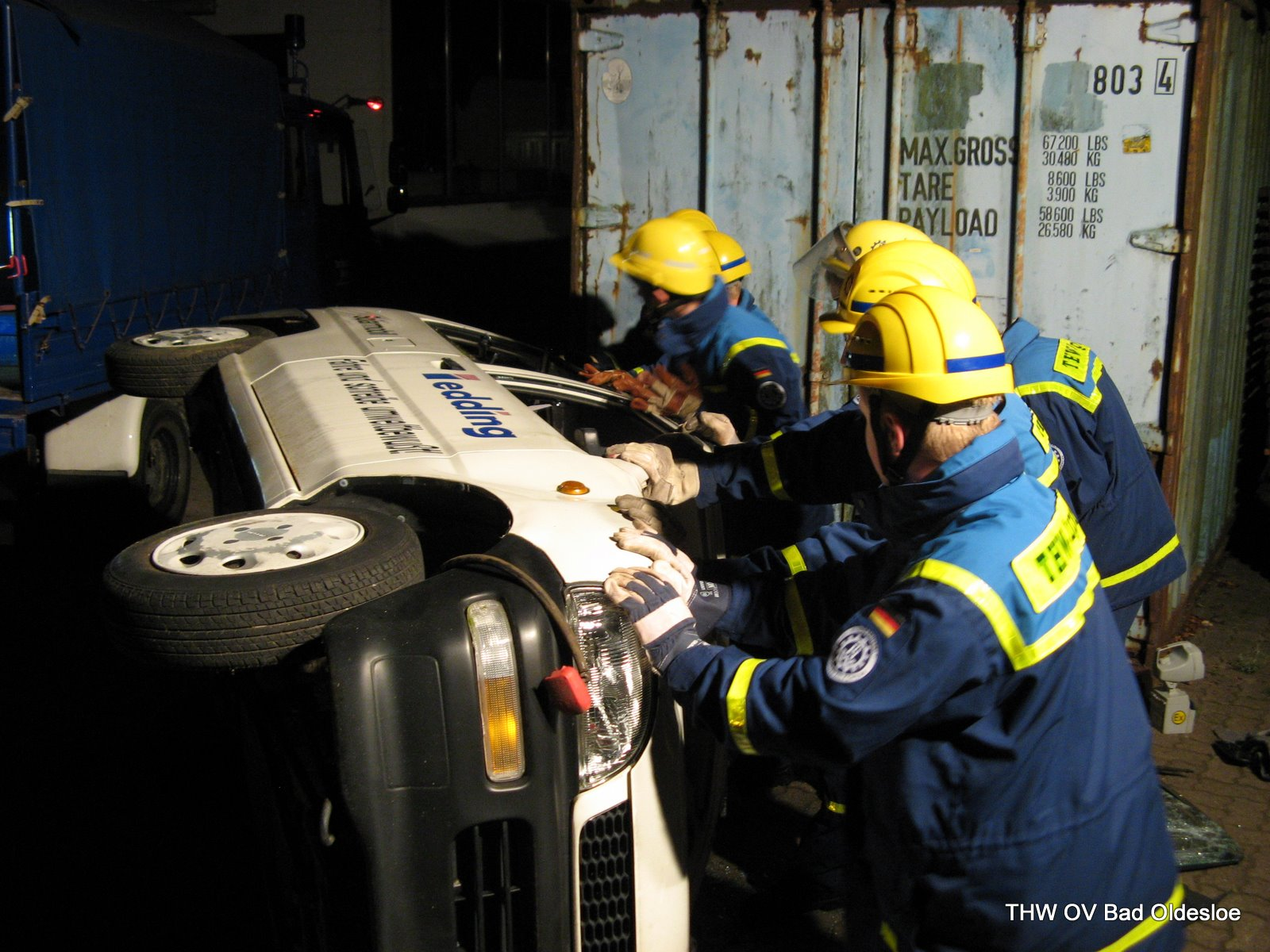 Während die eine Bergungsgruppe weiter die Vermissten suchten, gab es für die übrigen drei Gruppen ebenfalls einen Einsatz. Beim Abschleppunternehmen Buske in Bargteheide war ein Auto umgekippt und der Fahrer eingeklemmt. Während die Fachgruppe Beleuchtung für das rechte Licht sorgte, kümmerten sich die beiden Bergungsgruppen um das umgekippte Fahrzeug. Fachmännisch wurde das umgekippte Auto wieder auf die Räder gestellt und die Übungspuppe des Ortsverbandes Ahrensburg daraus befreit.