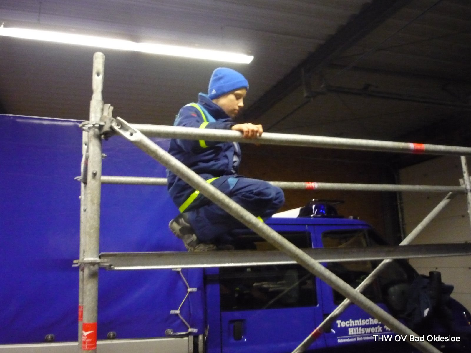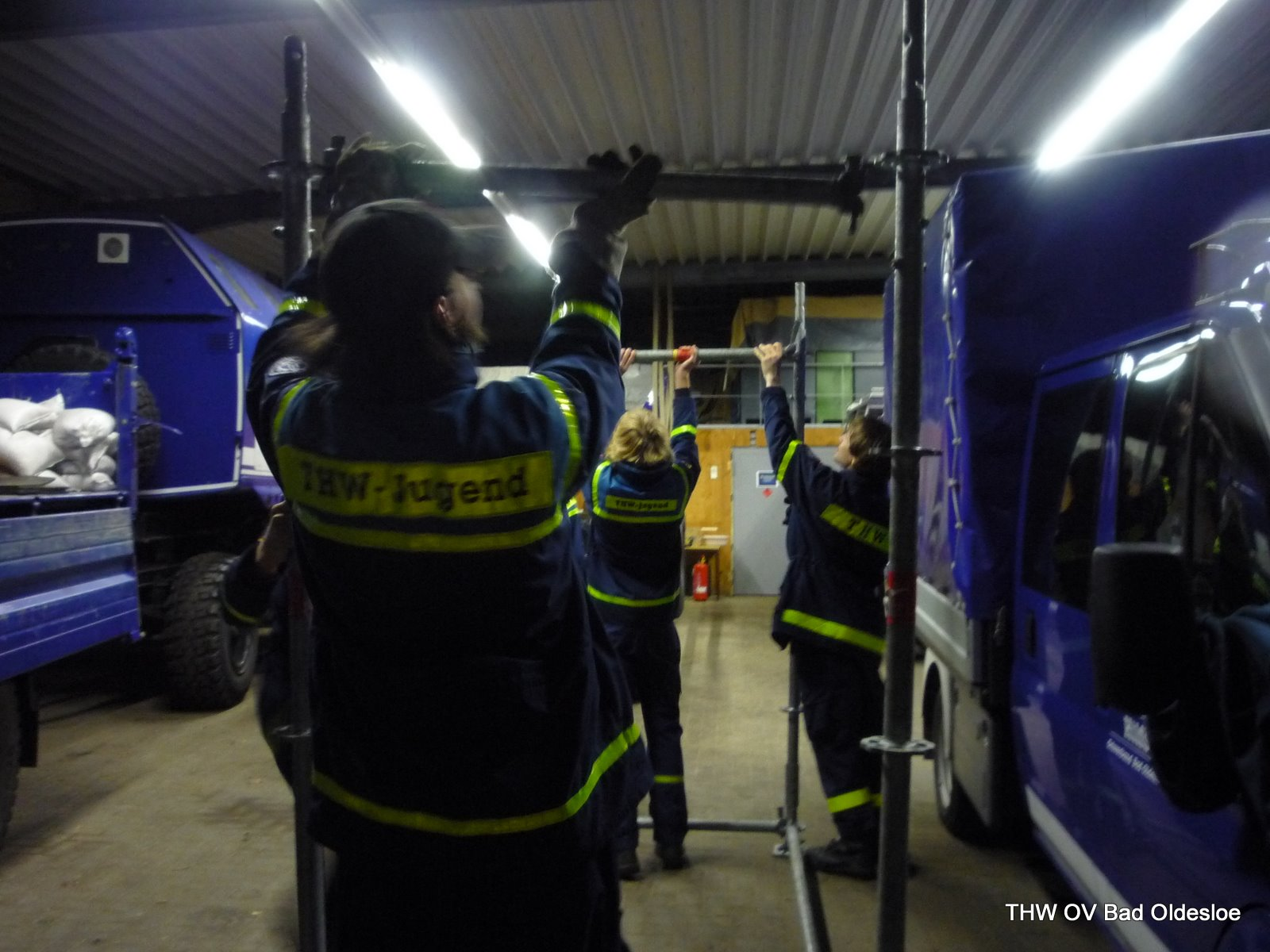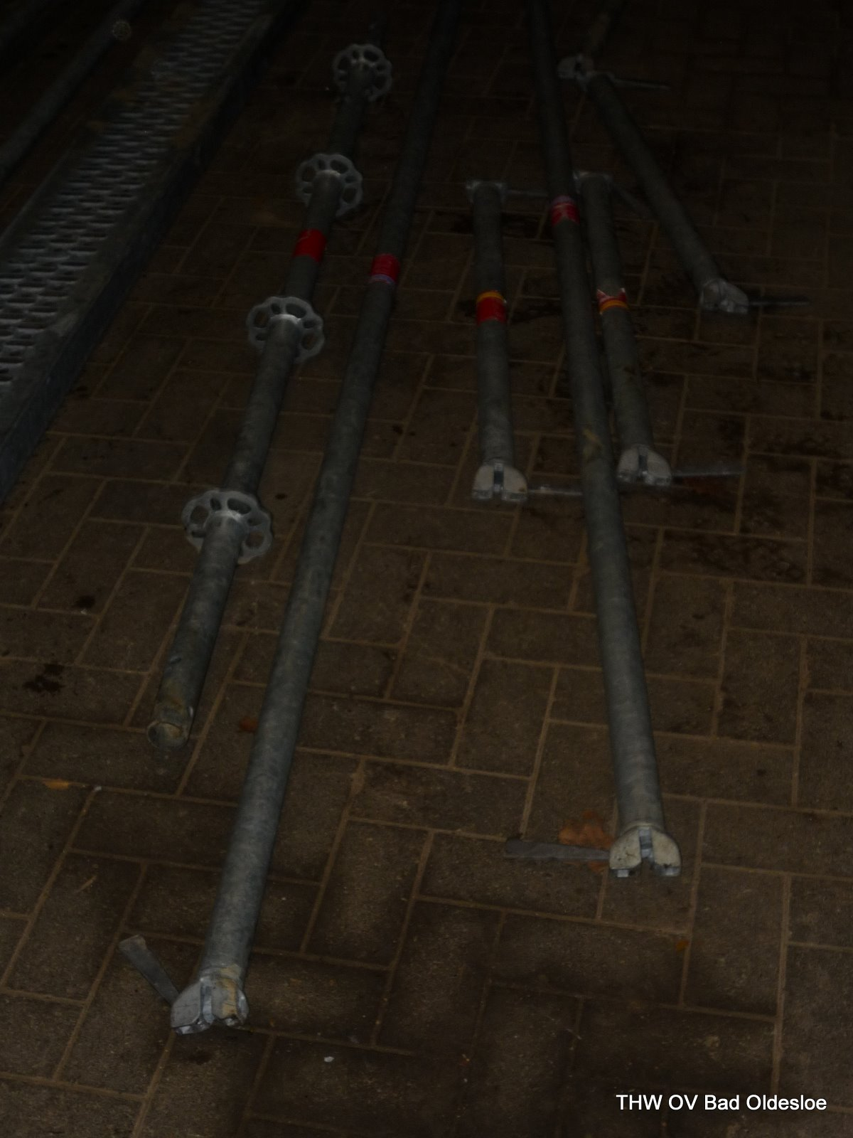 An diesem Mittwoch haben wir uns dazu entschieden, das Einsatzgerüstsystem (EGS) aufzubauen. Wegen der frühen Dämmerung und dem regnerischem Wetter, brachten wir die EGS-Bauteile erst in die Fahrzeughalle. Dort konnten wir das System nach einem Aufbauplan und Vorkenntnissen errichten. Nachdem das EGS mit Querstangen stabilisiert worden war, beschlossen wir diese Höhe zu nutzen und bauten nach unseren theoretischen Wissen einen Leiterhebel. Diesen könnten wir aber nicht ganz nach Plan bauen, da wir das EGS noch abbauen und die Bauteile zurück in den Anhänger bringen mussten.