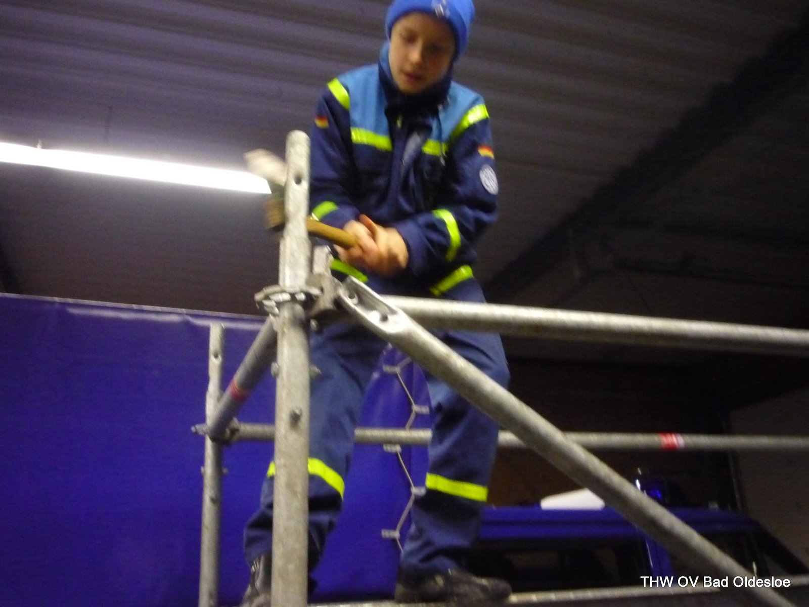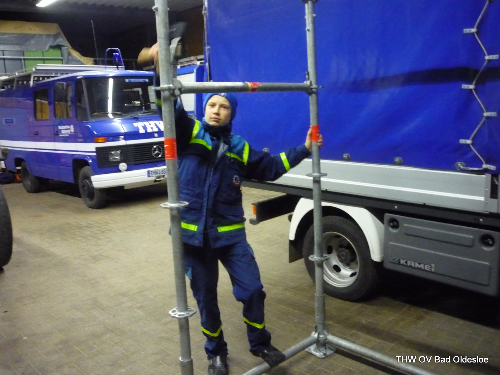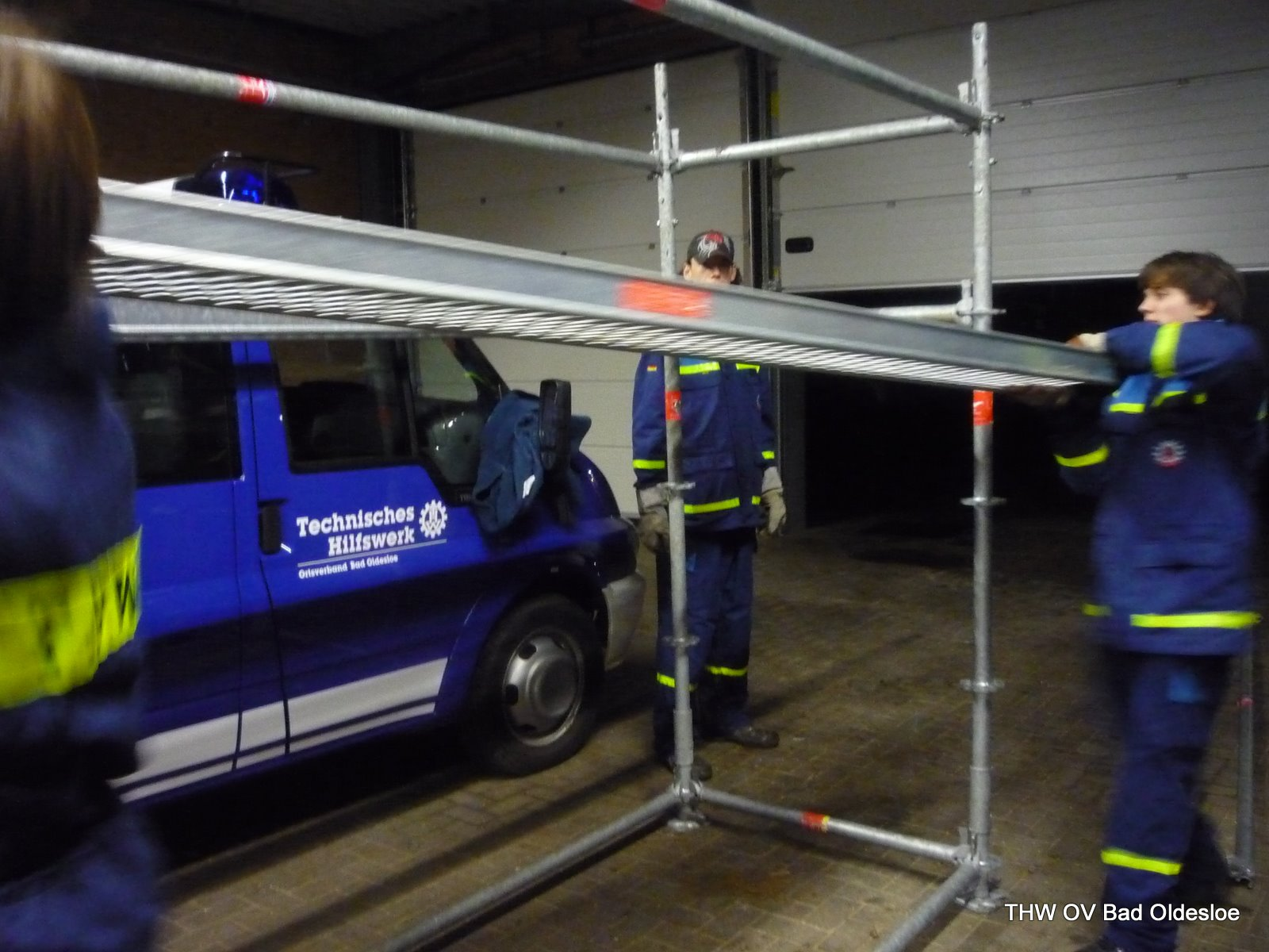 An diesem Mittwoch haben wir uns dazu entschieden, das Einsatzgerüstsystem (EGS) aufzubauen. Wegen der frühen Dämmerung und dem regnerischem Wetter, brachten wir die EGS-Bauteile erst in die Fahrzeughalle. Dort konnten wir das System nach einem Aufbauplan und Vorkenntnissen errichten. Nachdem das EGS mit Querstangen stabilisiert worden war, beschlossen wir diese Höhe zu nutzen und bauten nach unseren theoretischen Wissen einen Leiterhebel. Diesen könnten wir aber nicht ganz nach Plan bauen, da wir das EGS noch abbauen und die Bauteile zurück in den Anhänger bringen mussten.