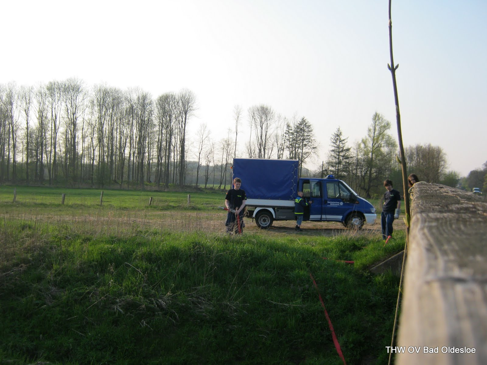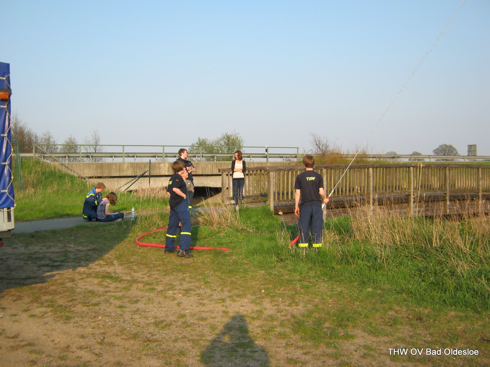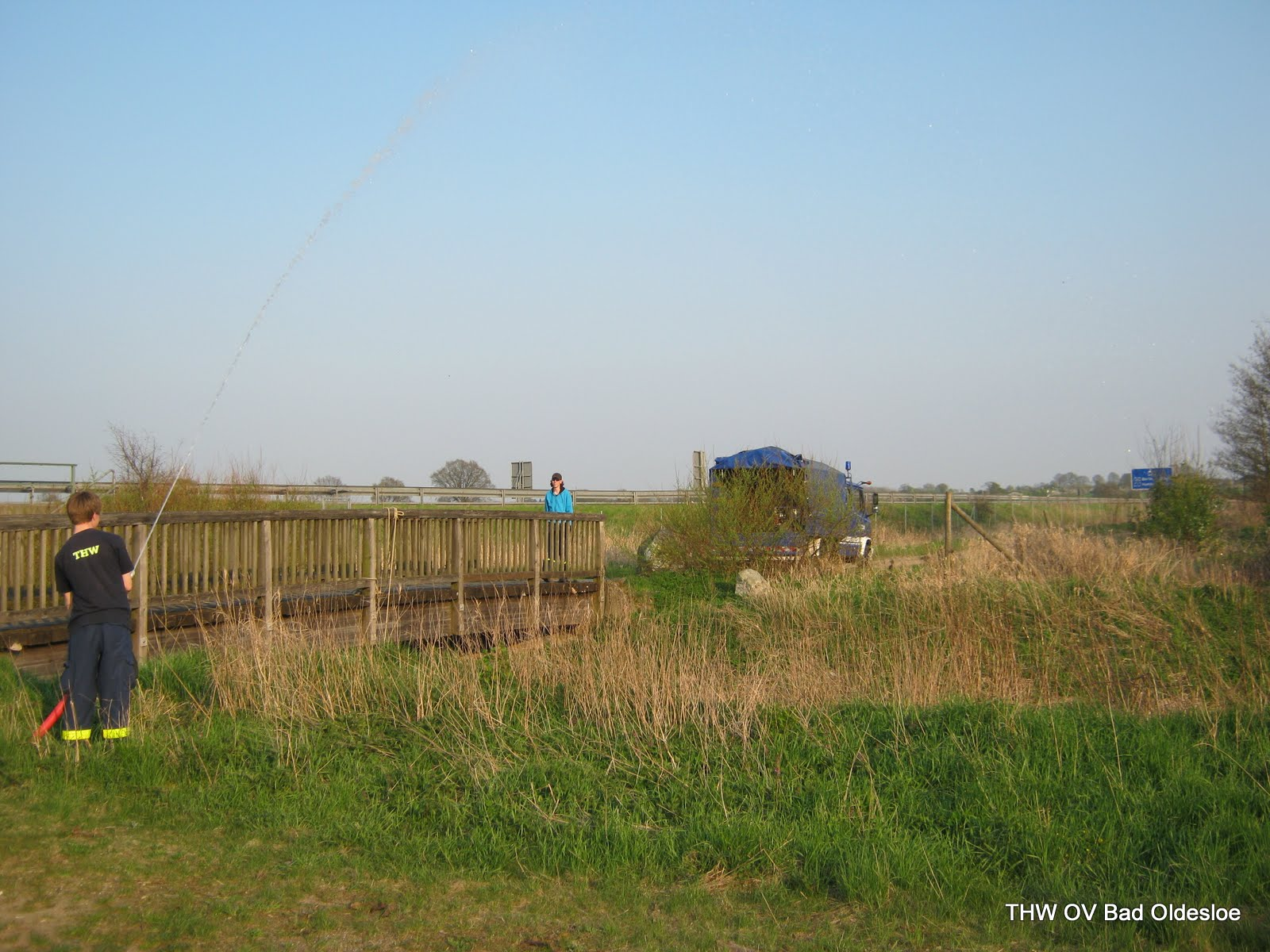 Auf Wunsch einiger fuhren wir heute raus und und planten eine Pumpstrecke und einen Steg aufzubauen. Vor Ort auf einem Feldweg neben der A21 an der Beste, schon mit Verspätung angekommen, stellte sich heraus, dass es wohl eine zweite Verzögerung geben würde: Ein LKW-Fahrer meldete uns, dass nur wenige hundert Meter von uns entfernt ein Auto in einer Kurve auf der Autobahn in den Graben gefahren sei. Simon meldete dies gleich weiter an die Leitstelle. Nun bekamen wir die Aufgabe, zu erkunden, ob es Verletzte gegeben hat. So verzögerte sich der eigentliche Jugenddienst weiter. Wieder an dem Feldweg angekommen entschieden wir uns daher den Aufbau eines Steges zu verwerfen und nur noch die Pumpe aufzubauen.