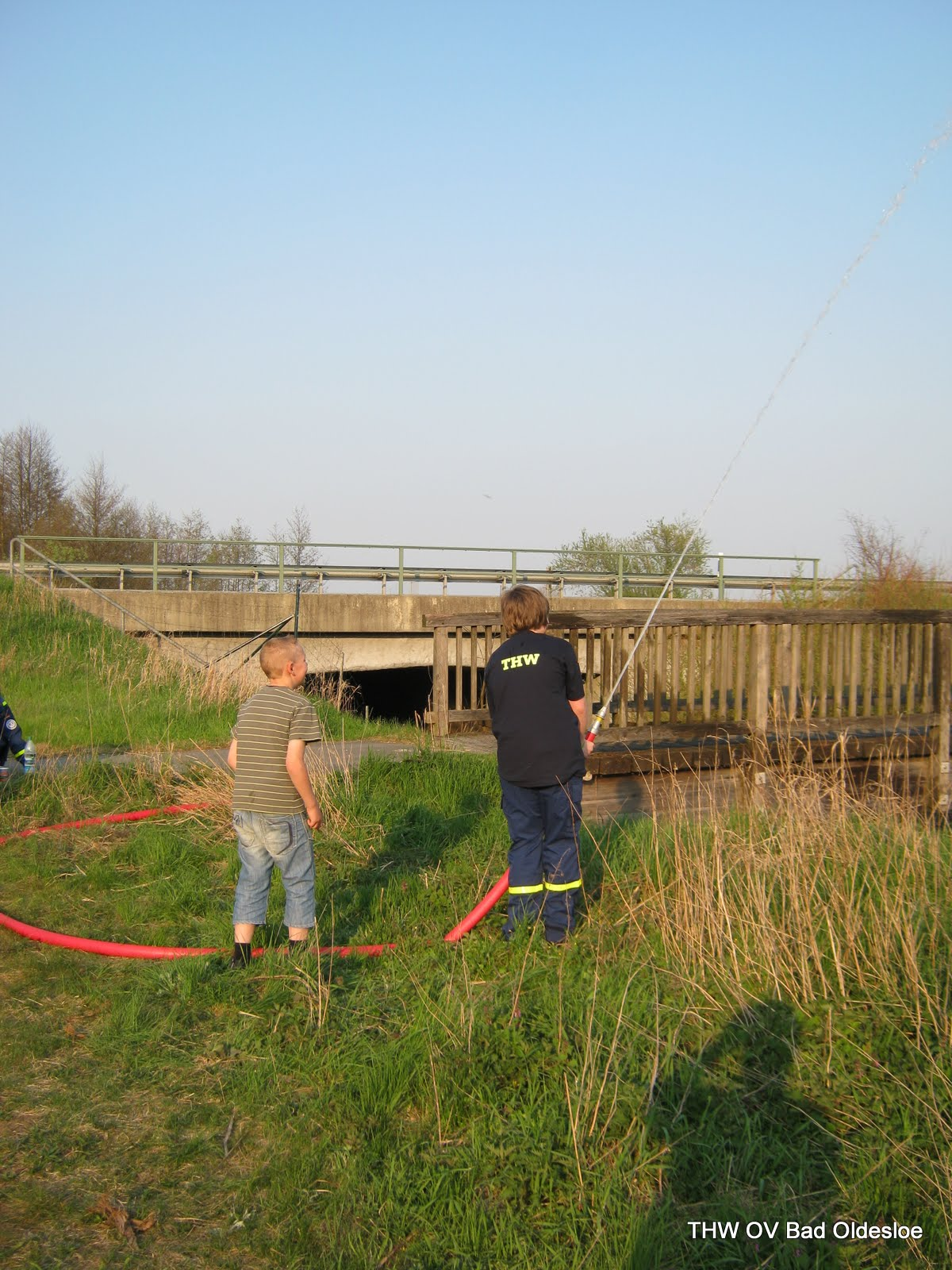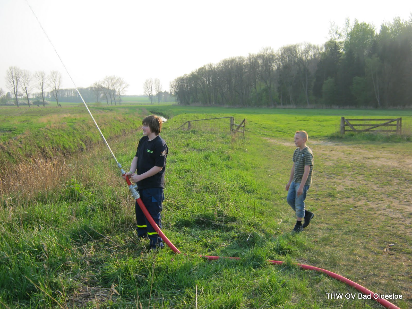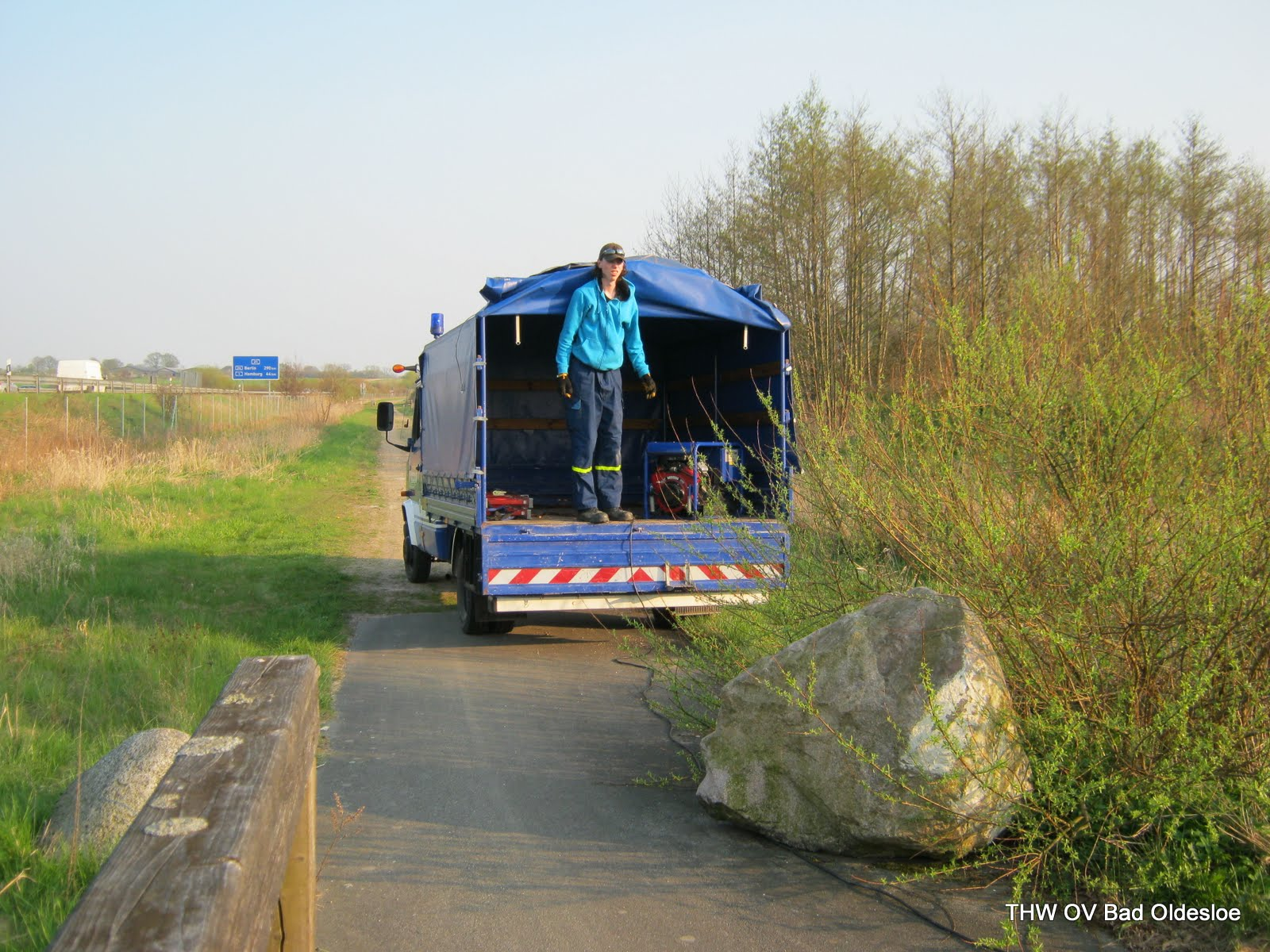 Auf Wunsch einiger fuhren wir heute raus und und planten eine Pumpstrecke und einen Steg aufzubauen. Vor Ort auf einem Feldweg neben der A21 an der Beste, schon mit Verspätung angekommen, stellte sich heraus, dass es wohl eine zweite Verzögerung geben würde: Ein LKW-Fahrer meldete uns, dass nur wenige hundert Meter von uns entfernt ein Auto in einer Kurve auf der Autobahn in den Graben gefahren sei. Simon meldete dies gleich weiter an die Leitstelle. Nun bekamen wir die Aufgabe, zu erkunden, ob es Verletzte gegeben hat. So verzögerte sich der eigentliche Jugenddienst weiter. Wieder an dem Feldweg angekommen entschieden wir uns daher den Aufbau eines Steges zu verwerfen und nur noch die Pumpe aufzubauen.