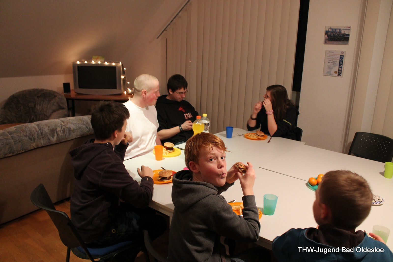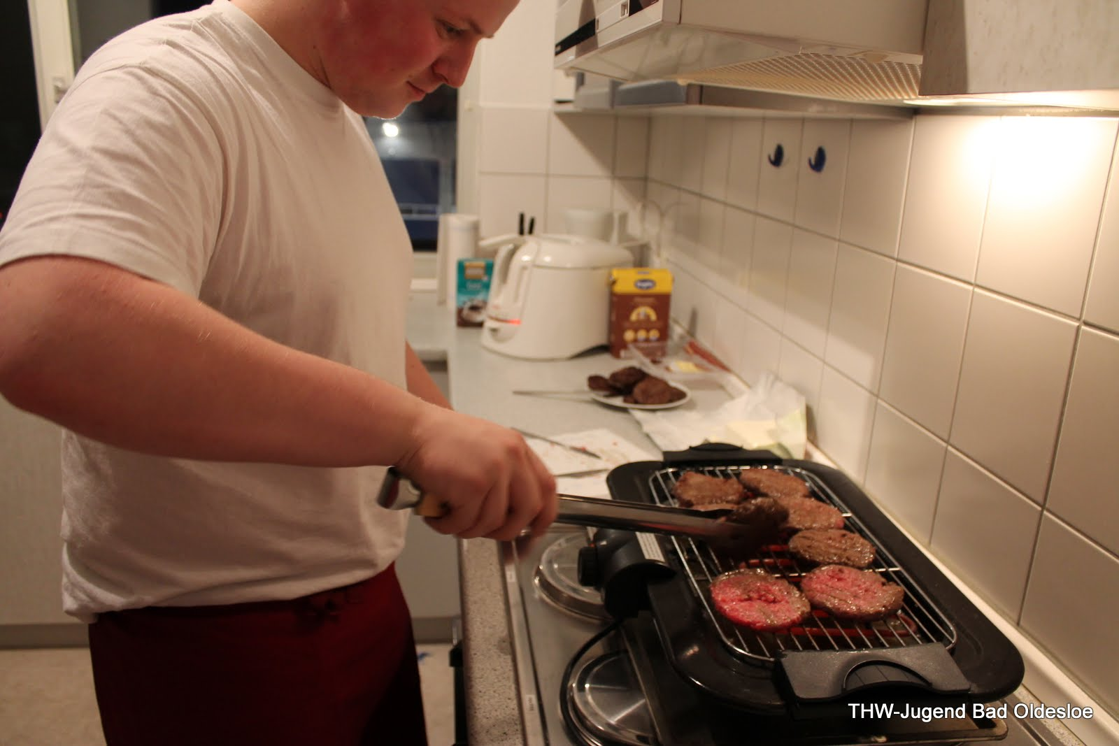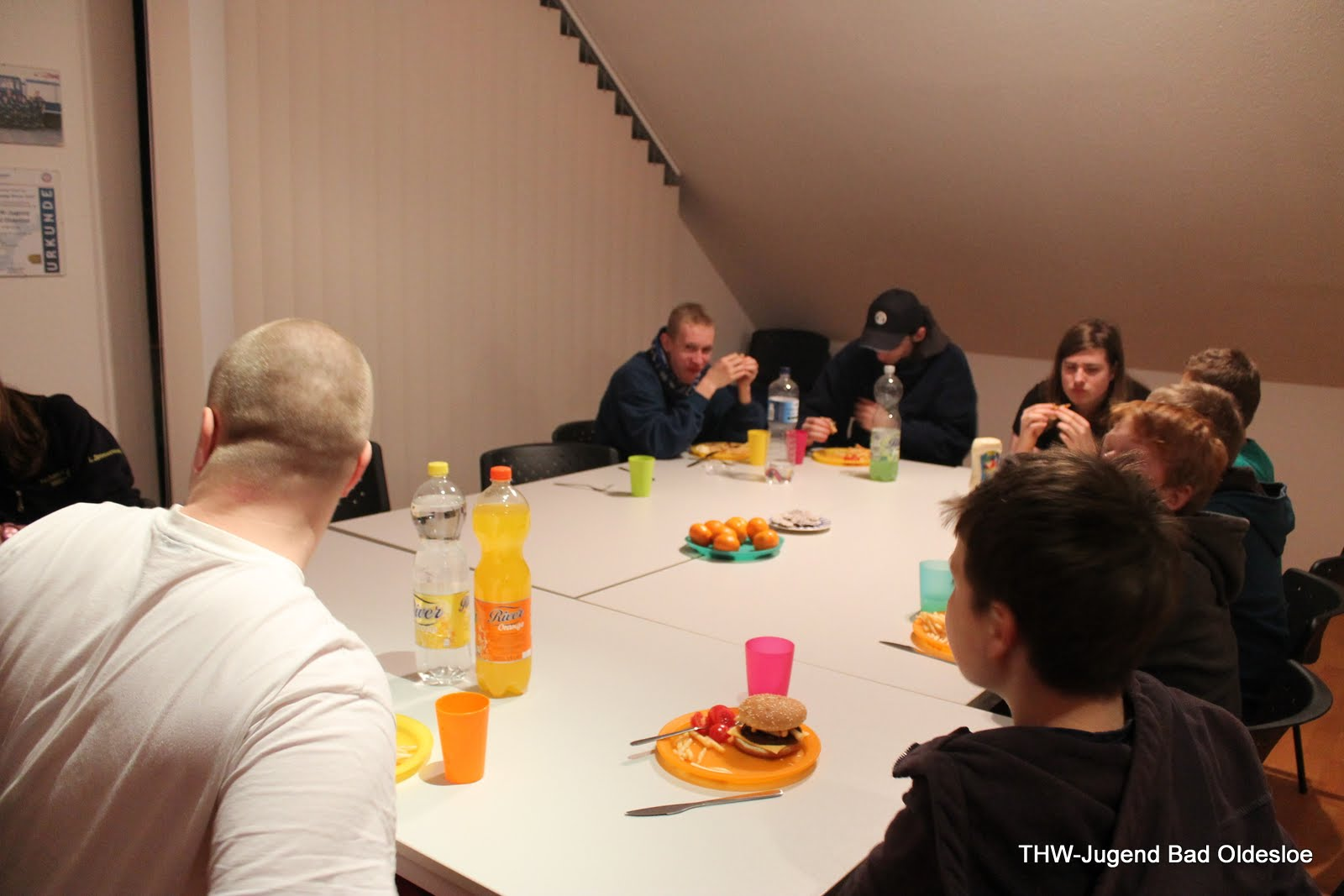 Wunsch der Jugendlichen war es, wie es schon langsam Tradition ist, Kekse zu backen. Aus etwa 4kg Teig wurden dann einige Bleche gefüllt. Im Anschluss wurden schon mal die Feldbetten aufgebaut und das Essen vorbereitet. Dieses Jahr gab es Hamburger. Als einige Probleme mit dem Grillen der Pads (die Hackfrikadellen im Hamburger) gelöst waren und die Betten vorbereitet waren, ging es an das Essen. Nach dem alle satt waren, hatten Laura und Christian noch eine kleine Nachtwanderung geplant. Diese wurde dann auch gleich als Verdauungsspaziergang genutzt. Nach 2,5 km durch den Reinfelder Staatsforst (Rehkoppel) und einigen Interessanten Fragen und Fakten zum Wald, ging es wieder zurück zum GKW und damit zum OV. Im Anschluss wurde im Ausbildungsraum ein Film gesehen. Die Jugendlichen entschieden sich für einige Mr. Bean-Folgen, die Nico auf DVD mitgebracht hatte.