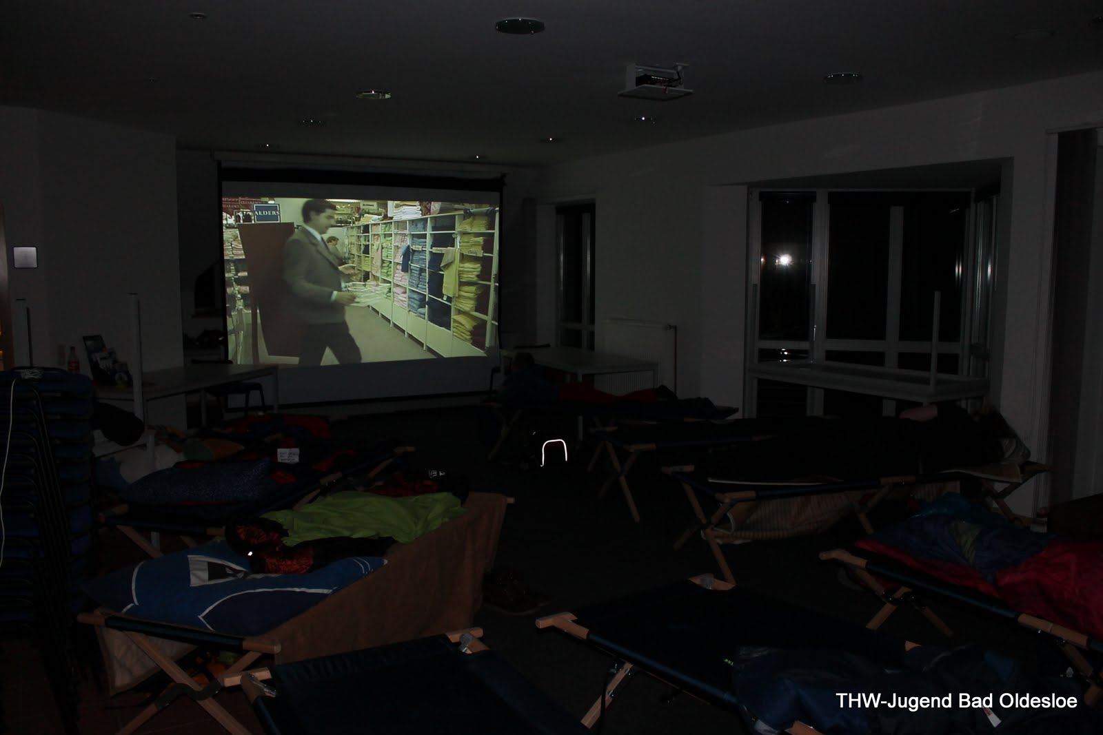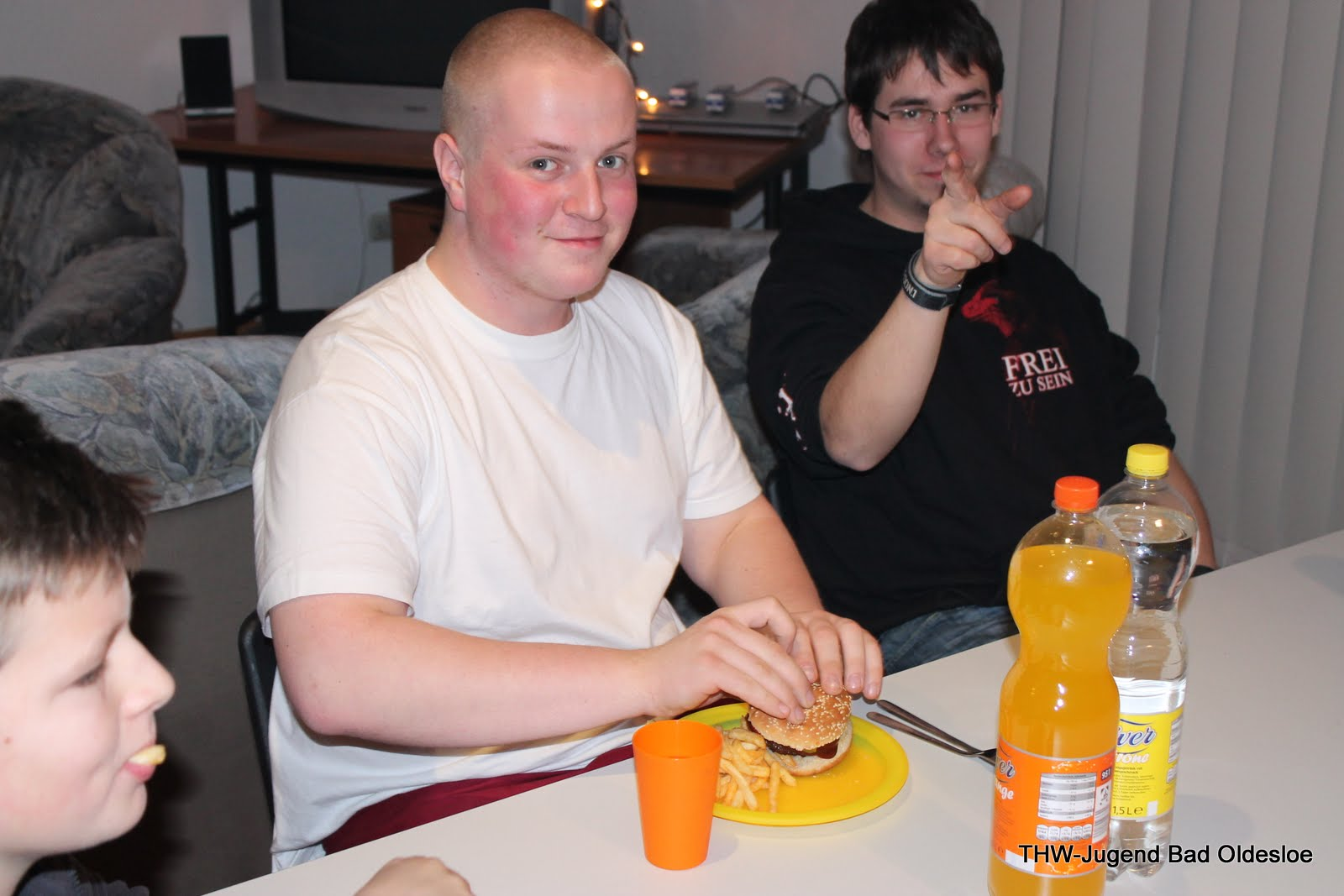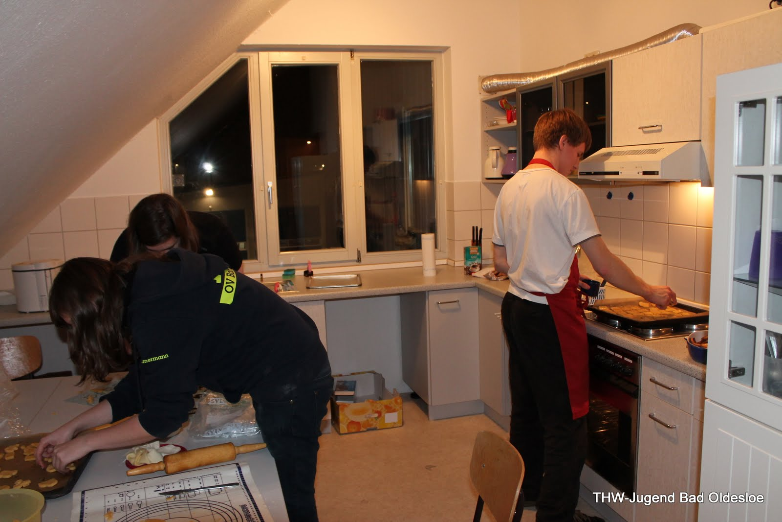 Wunsch der Jugendlichen war es, wie es schon langsam Tradition ist, Kekse zu backen. Aus etwa 4kg Teig wurden dann einige Bleche gefüllt. Im Anschluss wurden schon mal die Feldbetten aufgebaut und das Essen vorbereitet. Dieses Jahr gab es Hamburger. Als einige Probleme mit dem Grillen der Pads (die Hackfrikadellen im Hamburger) gelöst waren und die Betten vorbereitet waren, ging es an das Essen. Nach dem alle satt waren, hatten Laura und Christian noch eine kleine Nachtwanderung geplant. Diese wurde dann auch gleich als Verdauungsspaziergang genutzt. Nach 2,5 km durch den Reinfelder Staatsforst (Rehkoppel) und einigen Interessanten Fragen und Fakten zum Wald, ging es wieder zurück zum GKW und damit zum OV. Im Anschluss wurde im Ausbildungsraum ein Film gesehen. Die Jugendlichen entschieden sich für einige Mr. Bean-Folgen, die Nico auf DVD mitgebracht hatte.