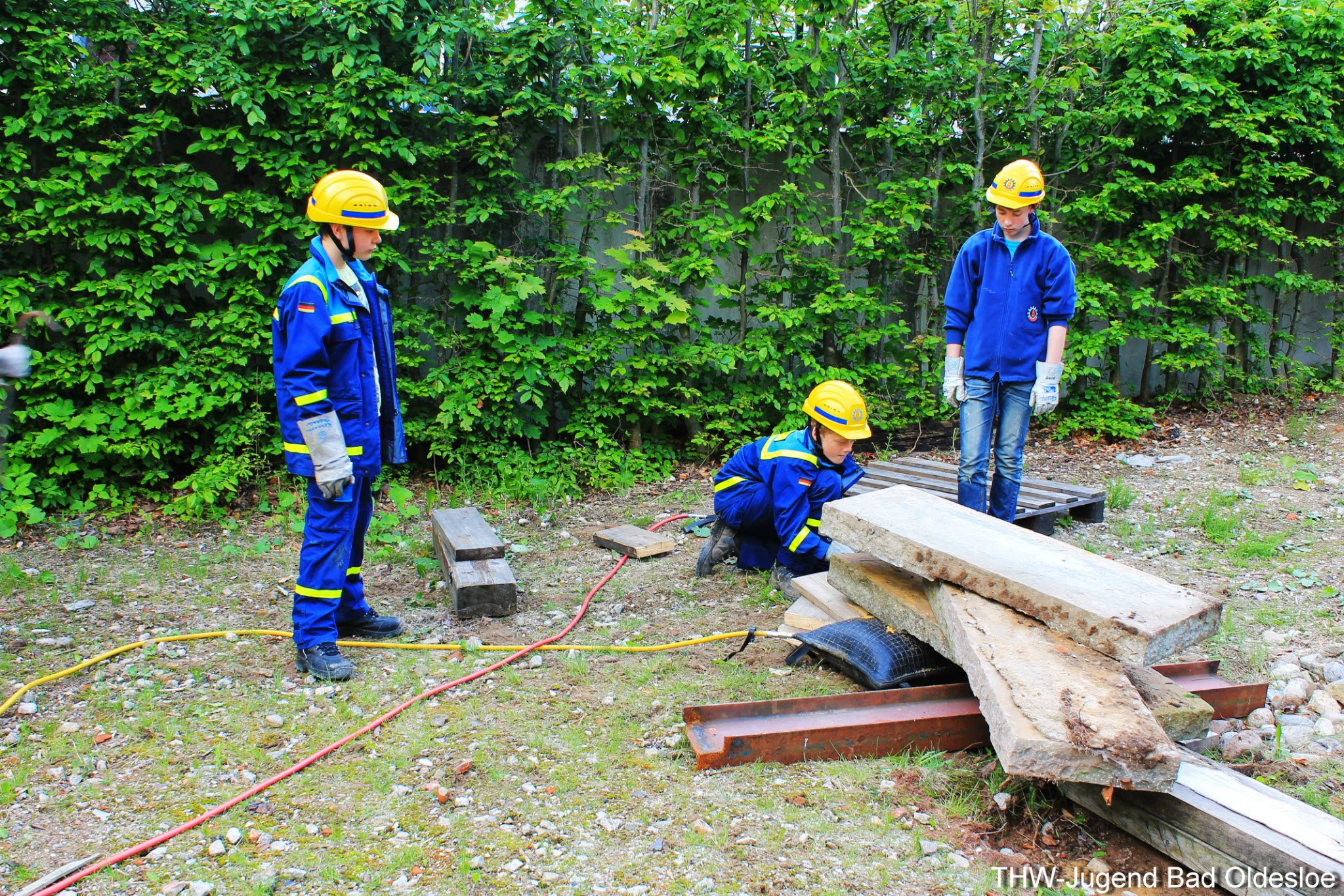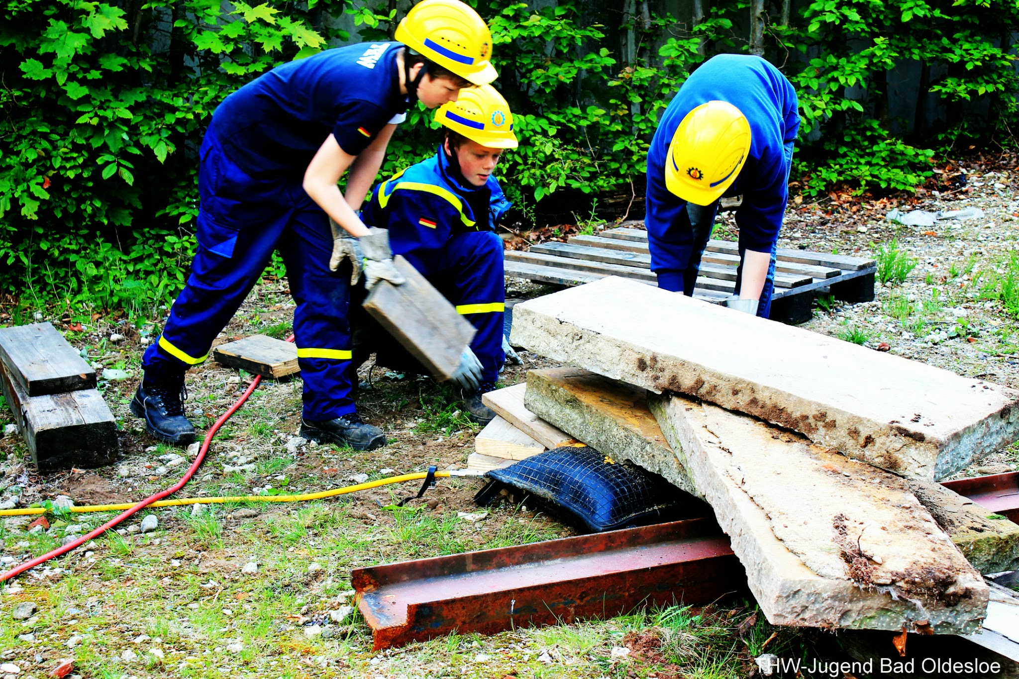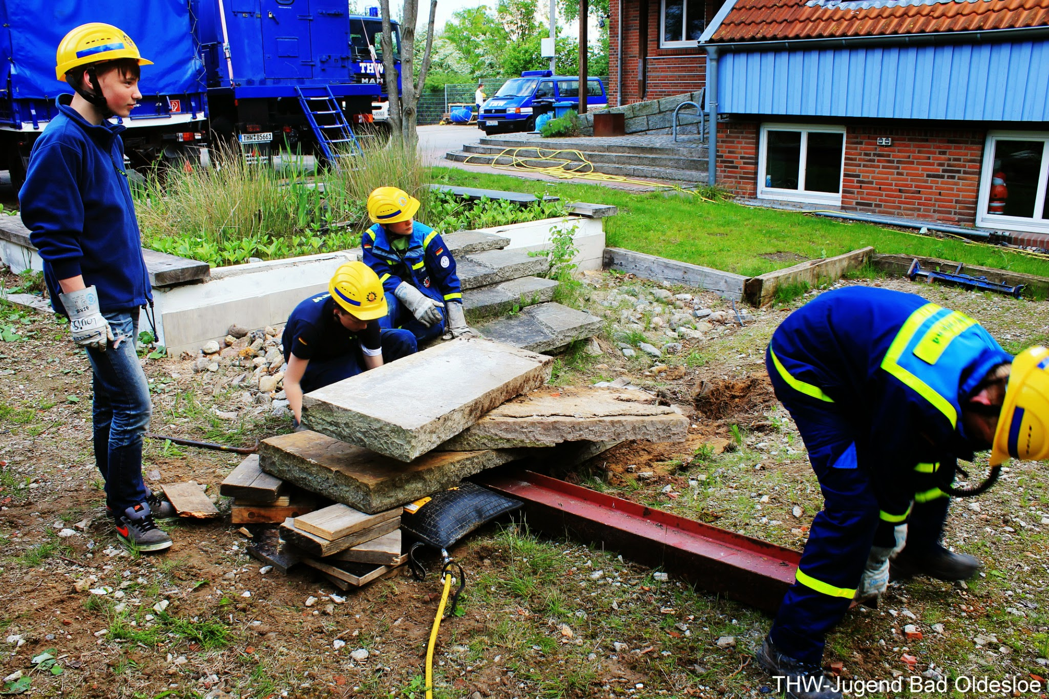 Die Aufgabe für die Kinder lautete einen Stahlträger zu retten, der in diesem Fall den Verletzten darstellte und unter Steinplatten begraben war. Die Aufgabe war kniffliger als gedacht, weil die Steinplatten ziemlich wackelig übereinander lagen. Dennoch gelang es beiden Gruppen schnell und sicher den Stahlträger zu retten und die Last zu sichern.
