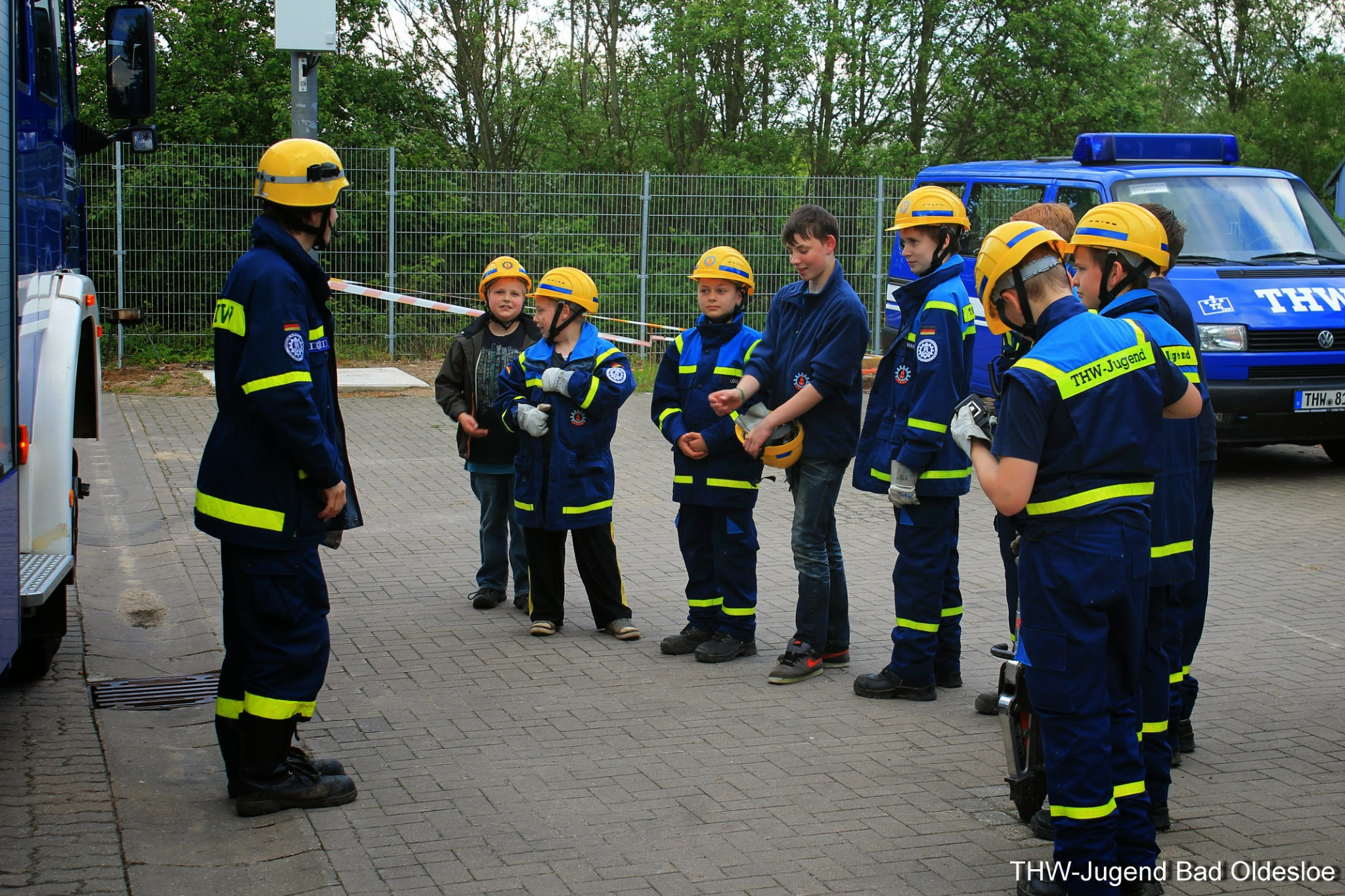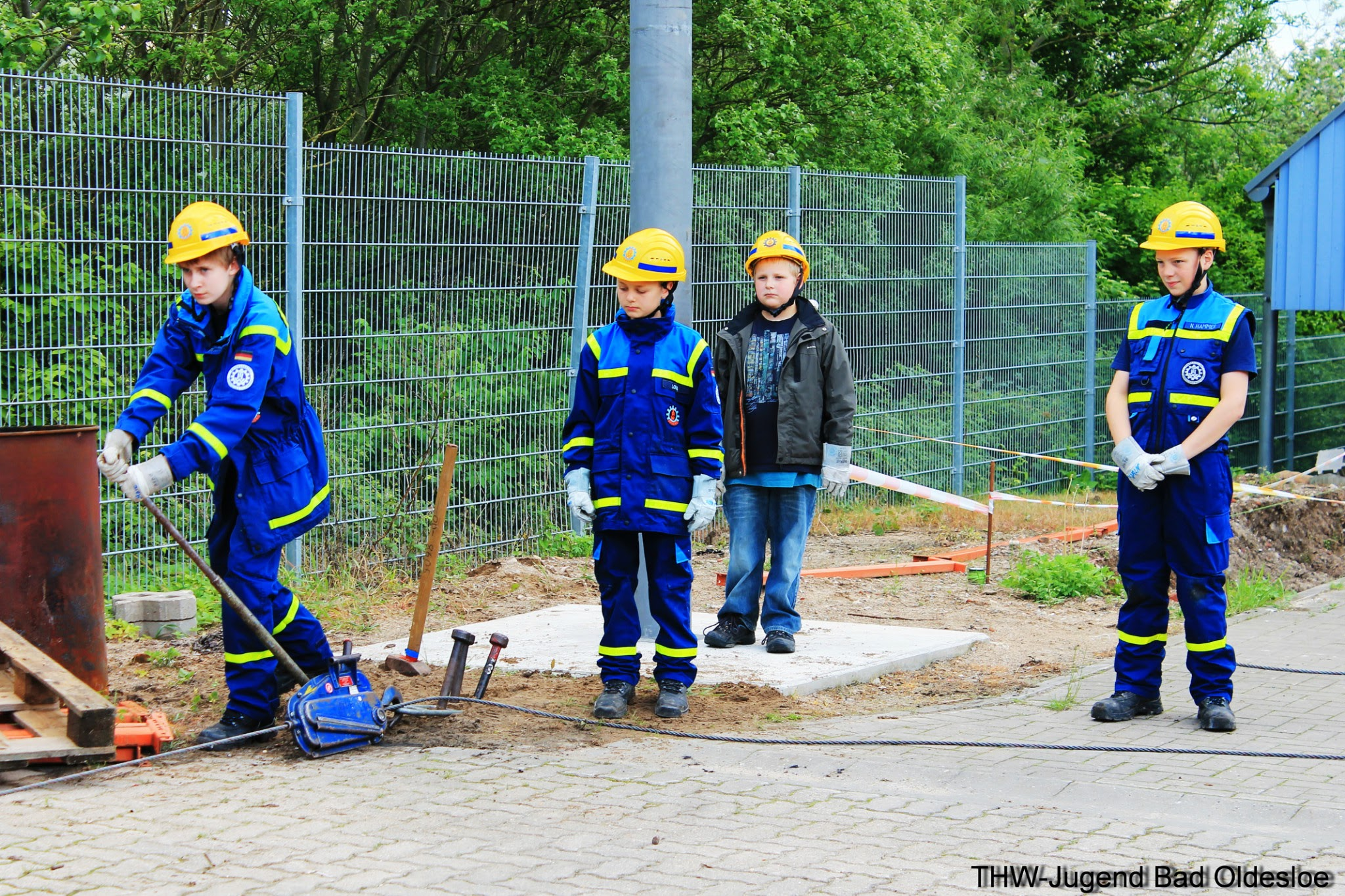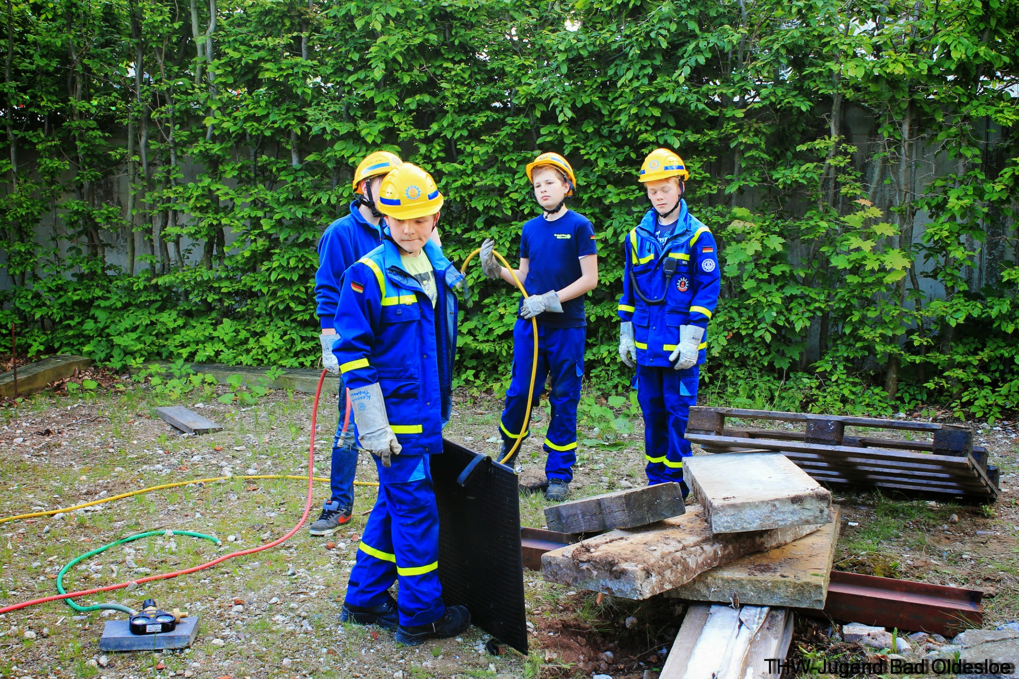 Die Aufgabe für die Kinder lautete einen Stahlträger zu retten, der in diesem Fall den Verletzten darstellte und unter Steinplatten begraben war. Die Aufgabe war kniffliger als gedacht, weil die Steinplatten ziemlich wackelig übereinander lagen. Dennoch gelang es beiden Gruppen schnell und sicher den Stahlträger zu retten und die Last zu sichern.