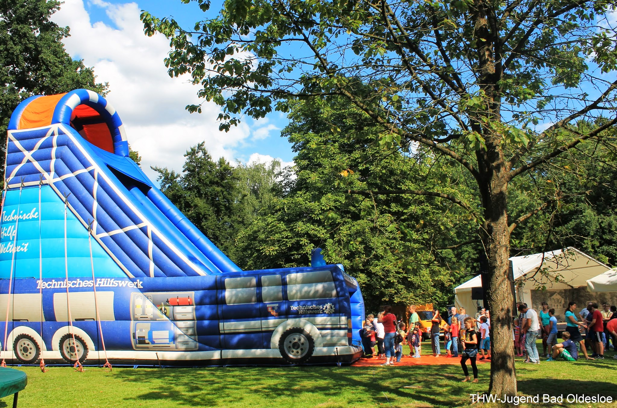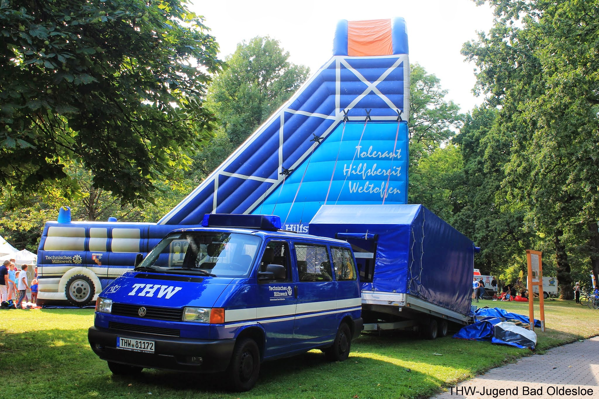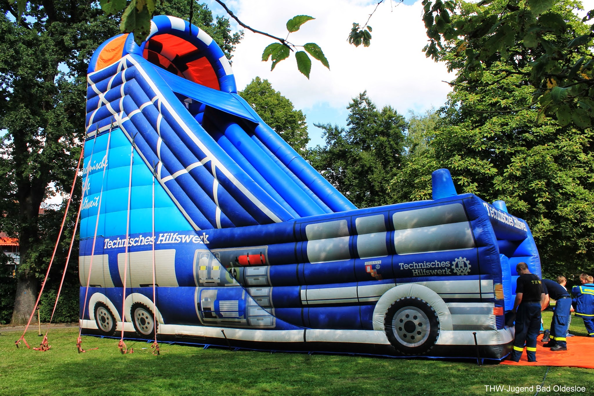 Der Samstag stand im Zeichen der Kinder. Spiel und Spaß soweit das Auge reichte, wenn da nicht die Riesenrutsche des Landeverbandes gestanden hätte. Denn zwischen Kinoleihenwand und Trampolin ragte die etwa 10 Meter hohe Rutsche in Form eines GKWs (Gerätekraftwagen) in die Höhe. Mit drei Jugendlichen und der Hilfe von vier Aktivhelfern stand sie nach gut einer Stunde. Danach beantworteten die Aktiven Fragen rund ums THW, während die Jugendlichen sich um die Sicherheit und Ordnung vor und auf dem Giganten kümmerten. Deshalb kam es trotz des hohen Andranges nicht zu Verletzungen, sodass die Sanitäter des ASBs nicht benötigt worden, welche sich ebenfalls kindgerecht präsentierten. Auch von der Rutsche aus konnte man durch die Bäume das Blaulicht des Rettungswagens und die Aufschrift der zwei anderen Fahrzeuge deutlich erkennen. Am späten Nachmittag wurde die Rutsche dann mit der zusätzlichen Hilfe zweier Helfer aus der Logistik abgebaut und ordentlich in den Anhänger verladen.