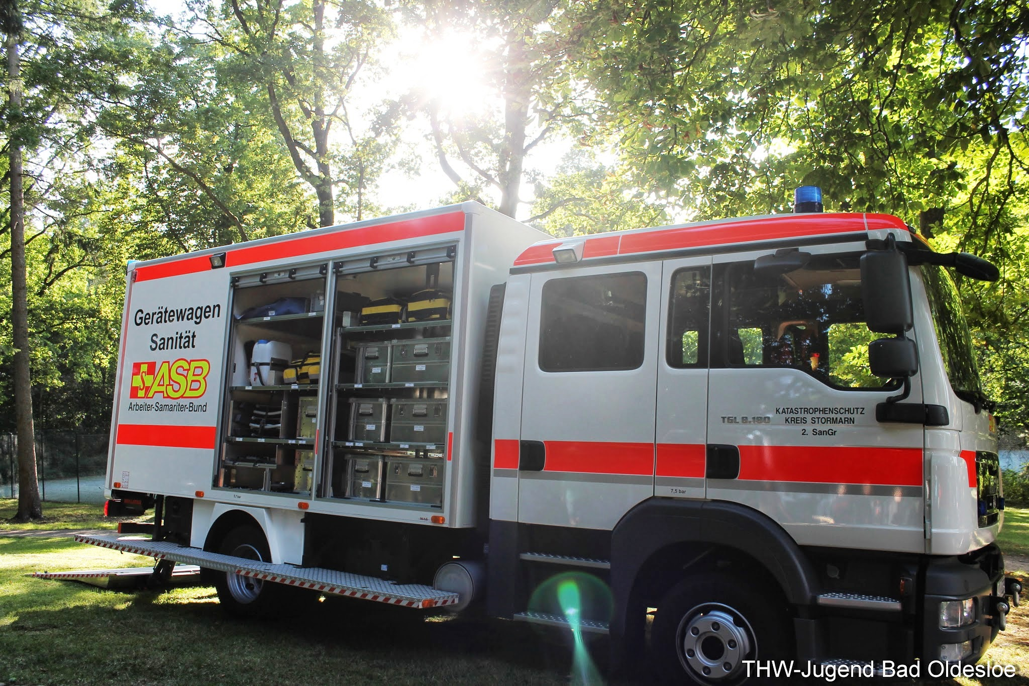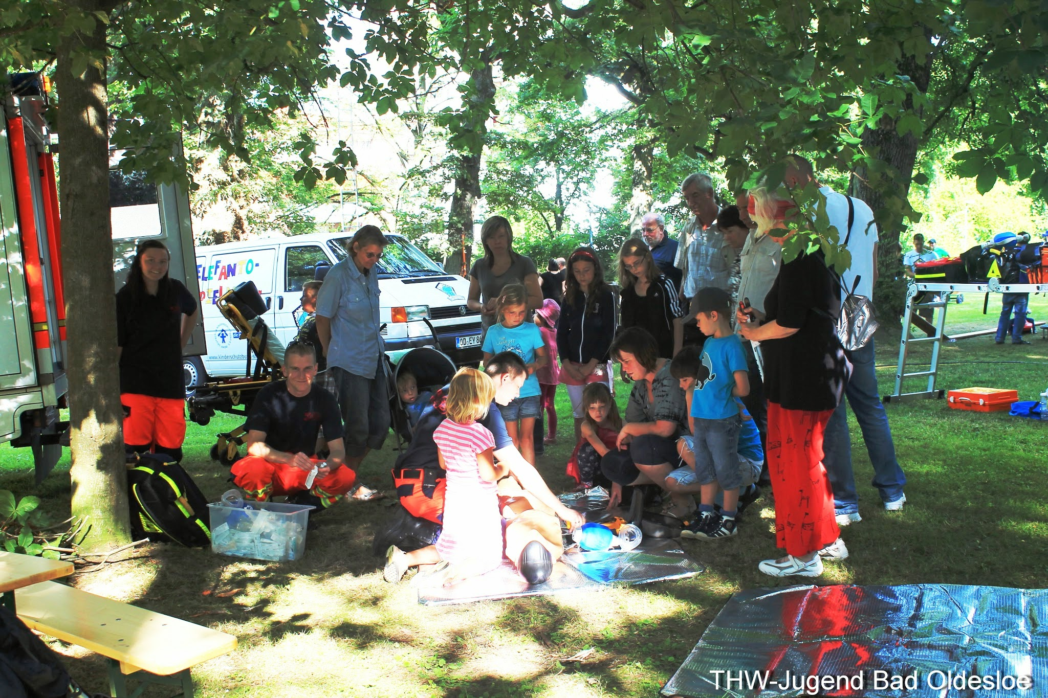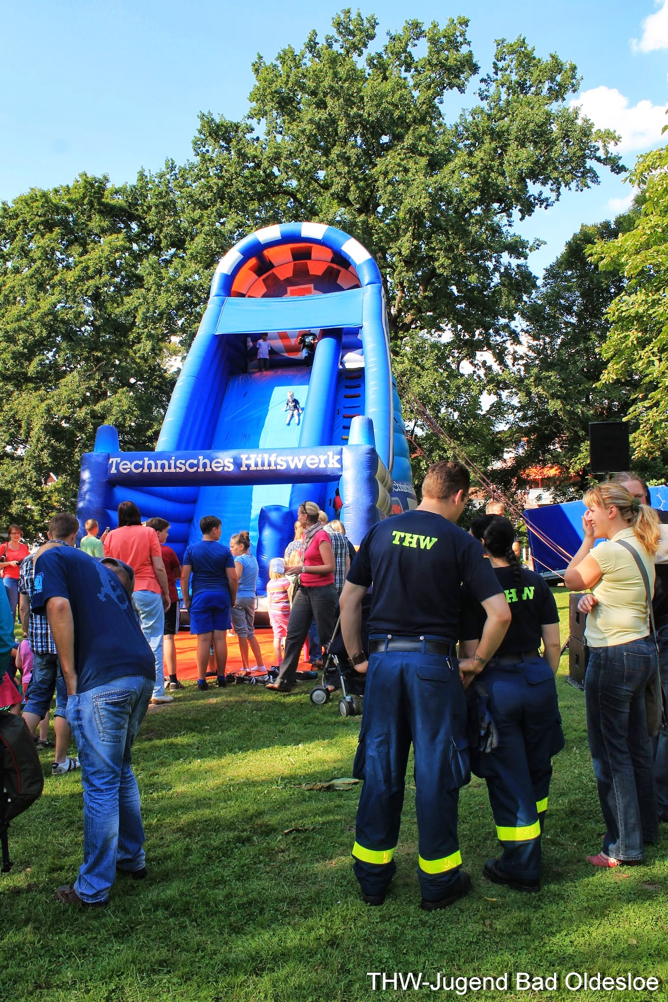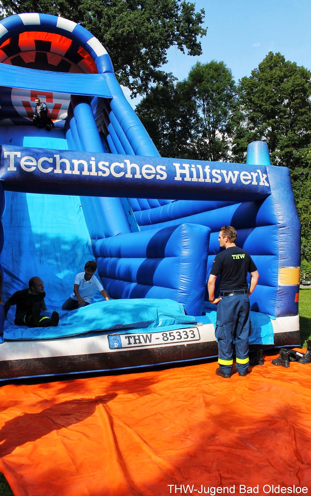 Der Samstag stand im Zeichen der Kinder. Spiel und Spaß soweit das Auge reichte, wenn da nicht die Riesenrutsche des Landeverbandes gestanden hätte. Denn zwischen Kinoleihenwand und Trampolin ragte die etwa 10 Meter hohe Rutsche in Form eines GKWs (Gerätekraftwagen) in die Höhe. Mit drei Jugendlichen und der Hilfe von vier Aktivhelfern stand sie nach gut einer Stunde. Danach beantworteten die Aktiven Fragen rund ums THW, während die Jugendlichen sich um die Sicherheit und Ordnung vor und auf dem Giganten kümmerten. Deshalb kam es trotz des hohen Andranges nicht zu Verletzungen, sodass die Sanitäter des ASBs nicht benötigt worden, welche sich ebenfalls kindgerecht präsentierten. Auch von der Rutsche aus konnte man durch die Bäume das Blaulicht des Rettungswagens und die Aufschrift der zwei anderen Fahrzeuge deutlich erkennen. Am späten Nachmittag wurde die Rutsche dann mit der zusätzlichen Hilfe zweier Helfer aus der Logistik abgebaut und ordentlich in den Anhänger verladen.
