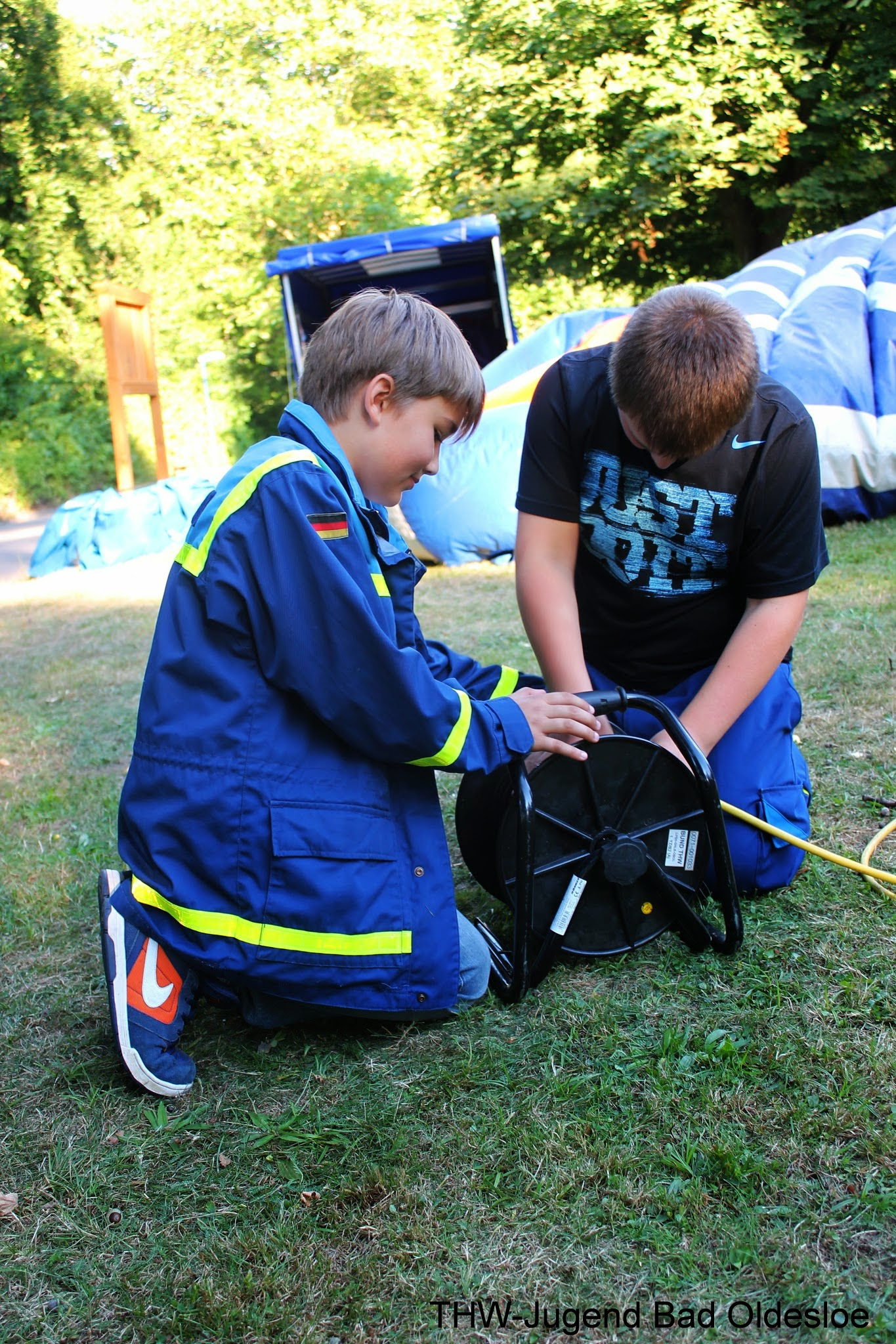 Schon am ersten Abend war eine Show mit Wasserfontänen und Lichtspielereien geplant. Ein Becken wurde neben die Bühne gestellt, indem das Wasserspektakel stattfinden sollte. Doch ohne Wasser keine Show. Und nun kamen die Jugendlichen ins Spiel. Sie rollten über 250m Schläuche und 150m Starkstromkabel aus, um die Distanz vom Becken bis zur Beste zu überwinden und installierten dort mehrere Pumpen. Nach dem Essen war der offizielle Dienst für die Junghelfer zu Ende. Zwei Helfer betreuten die Veranstaltung dann noch während der Vorführung um ggf. Wasser nachzuführen. Einige Junghelfer nutzen auch noch die Chance, am Abend sich als Abschluss zusammen mit Ihren Eltern die spektakuläre Wasser- und Lichtshow anzuschauen.