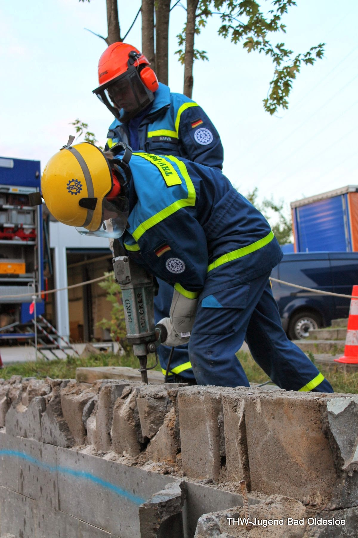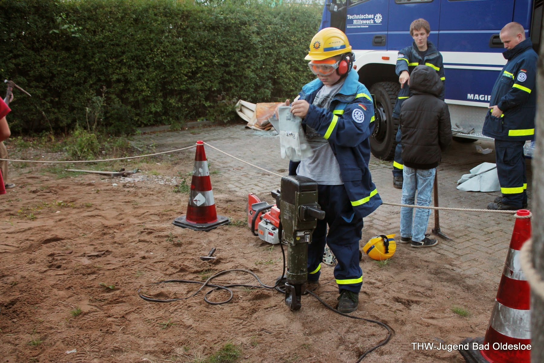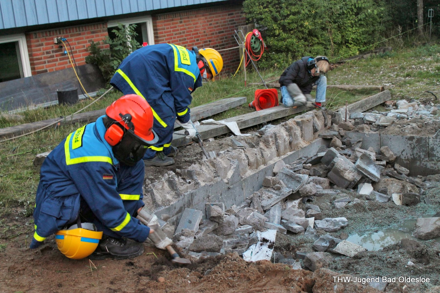 Während die einen sich mit Spitzhacke, Vorschlaghammer und kleineren Hämmern bewaffneten, bekämpften andere den gemauerten Rand des Teiches mit Bohr- und Aufbruchhammer. Trotz des hohen Beliebtheitsgrades der technischen Geräte, wechselten die Jugendlichen sich stetig ab und so bekam jeder mal die Möglichkeit – geschützt mit Helm, Handschuhen, Gehörschutz und Schutzbrille – die Geräte kennenzulernen. Diejenigen die gut mit dem Bohr- und Aufbruchhammer umgehen konnten, halfen den neueren.