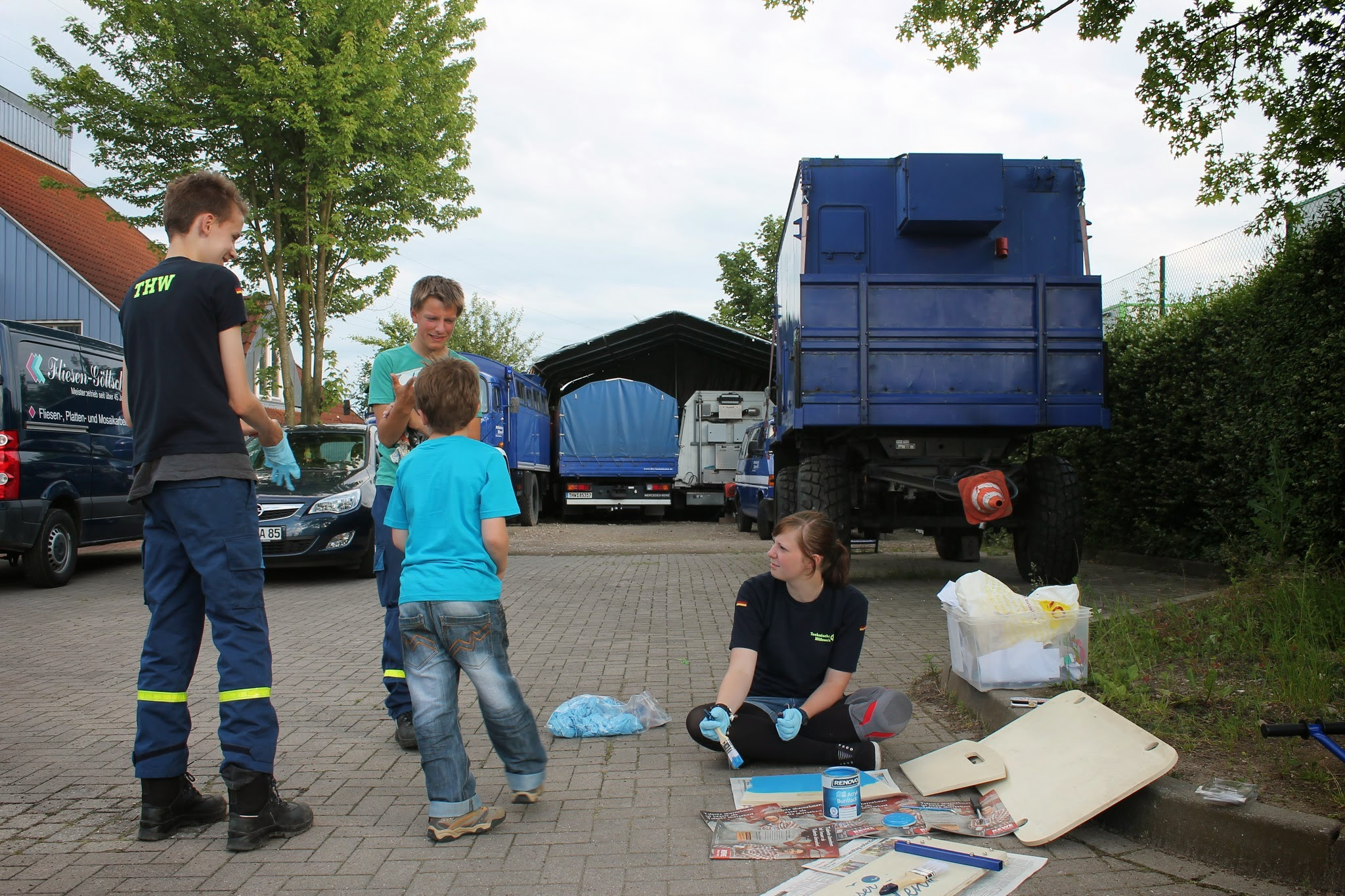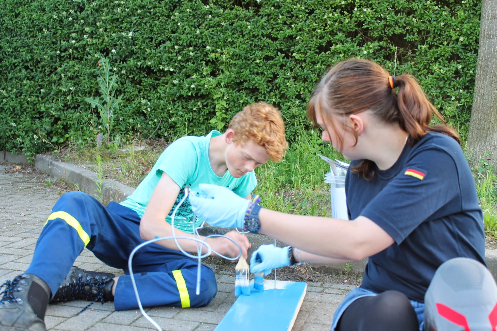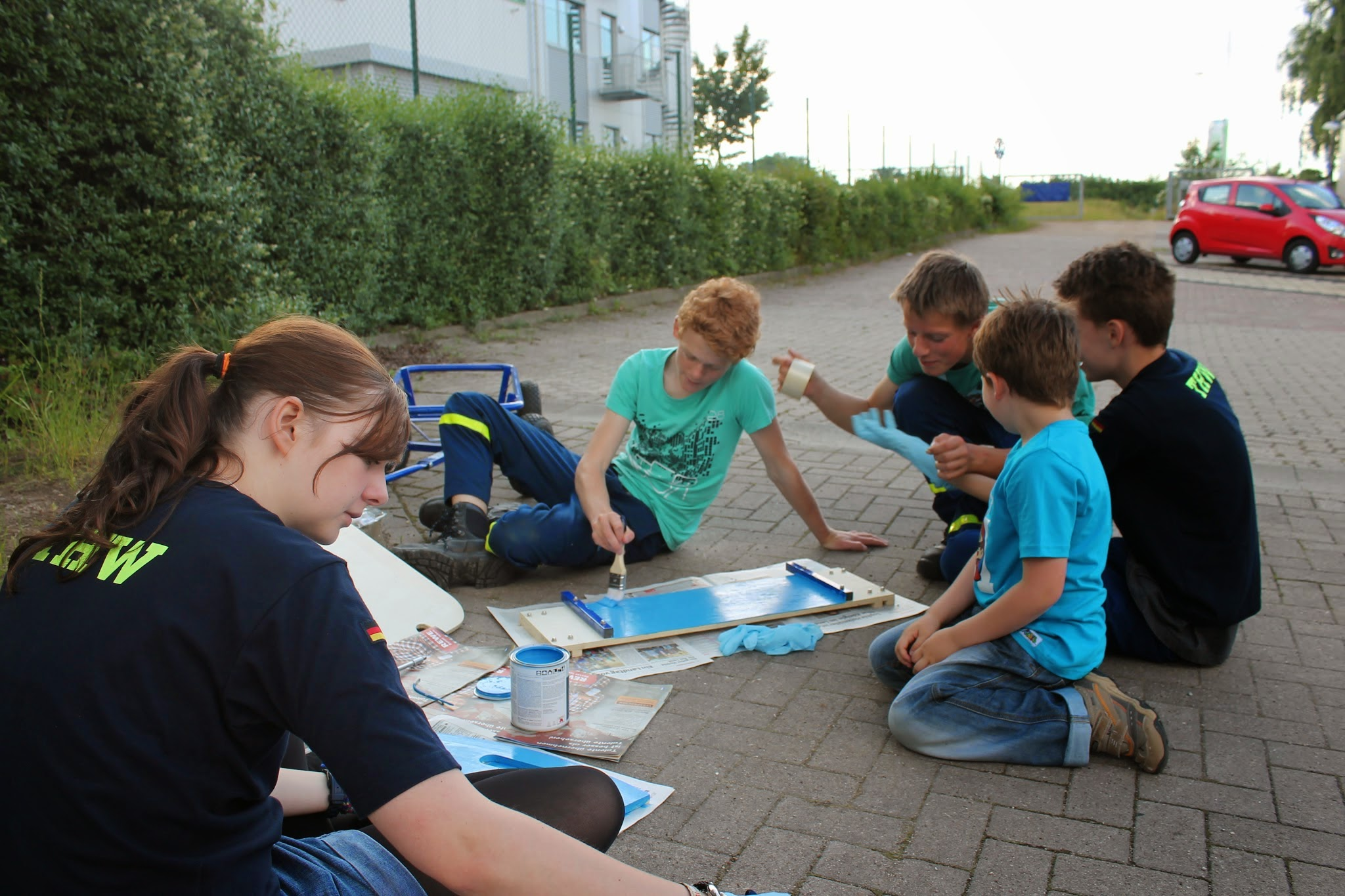 Dazu wurden die Jugendlichen aufgeteilt. Während die eine Gruppe in die Physik und Elektronik eintauchte – es sollte ein Signal geben, damit man weiß, wann und ob jemand den Draht berühre – kümmerte sich die andere Gruppe und das verbiegen und zusammenbasteln des Drahtes. Aufgrund der hohen Dienstbeteiligung fing eine dritte Gruppe an den Bollerwagen umzugestalten. Er sollte von „Unser Norden“ Schriftzug wegkommen und zu einem individuellen zur Oldesloer Jugendgruppe passenden Aussehen kommen. Dafür grundierten wir die zusammensteckbaren Außenteil erstmal mit dem typischen hellblau der Jugend. Nächste Woche werden dann die Einzelheiten gemalt.