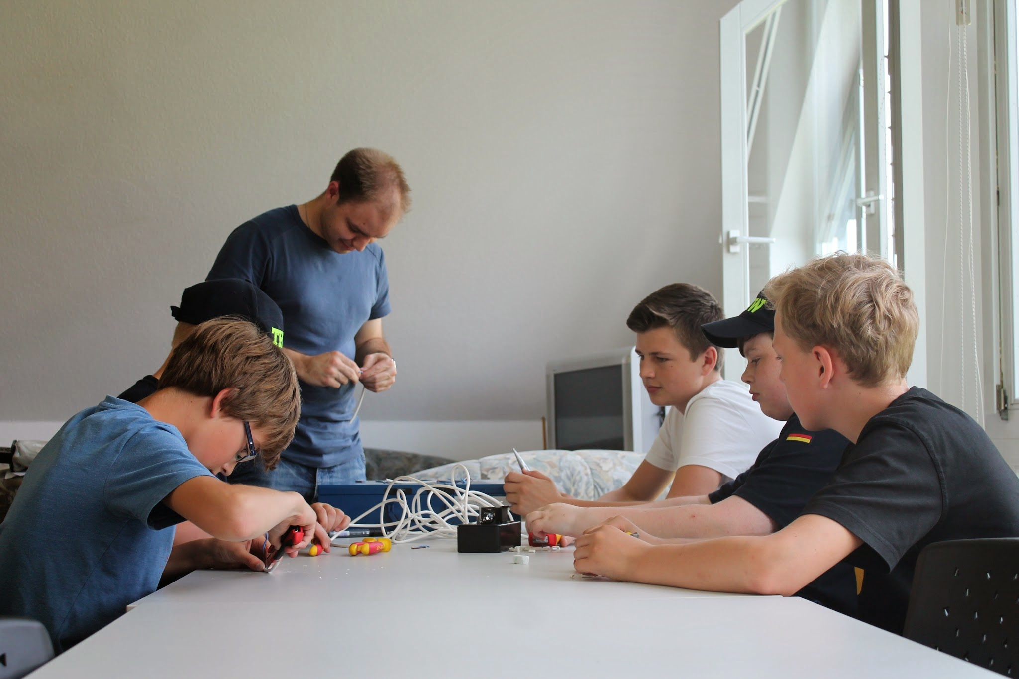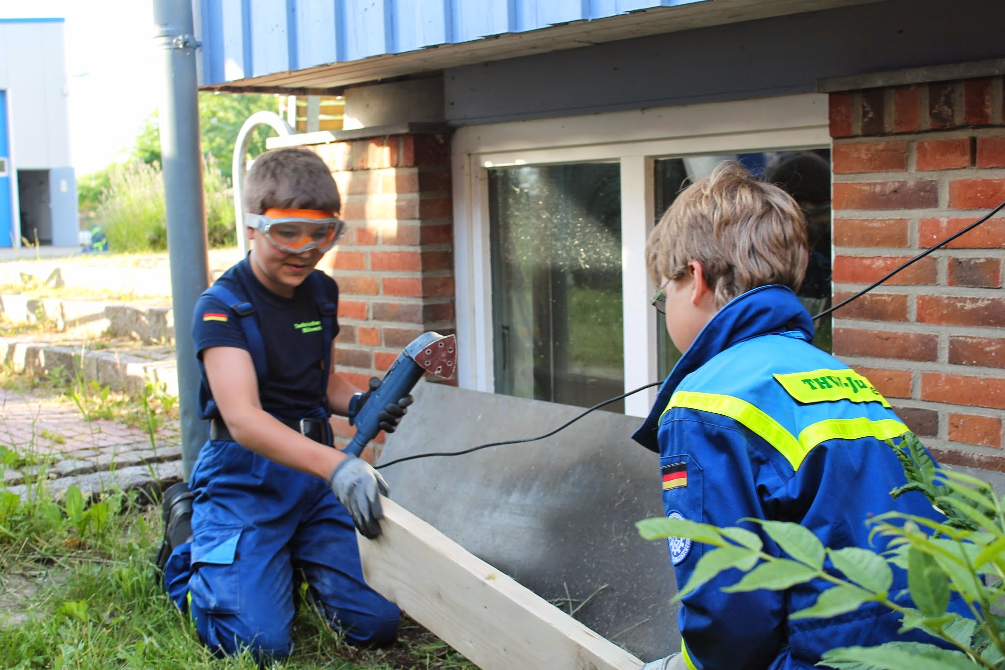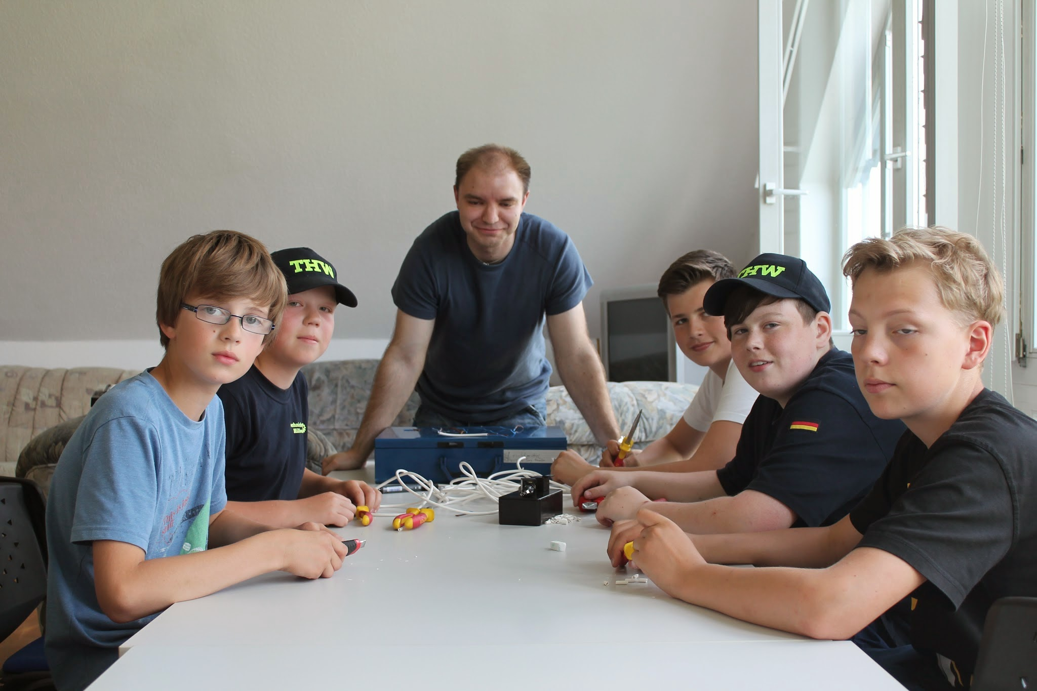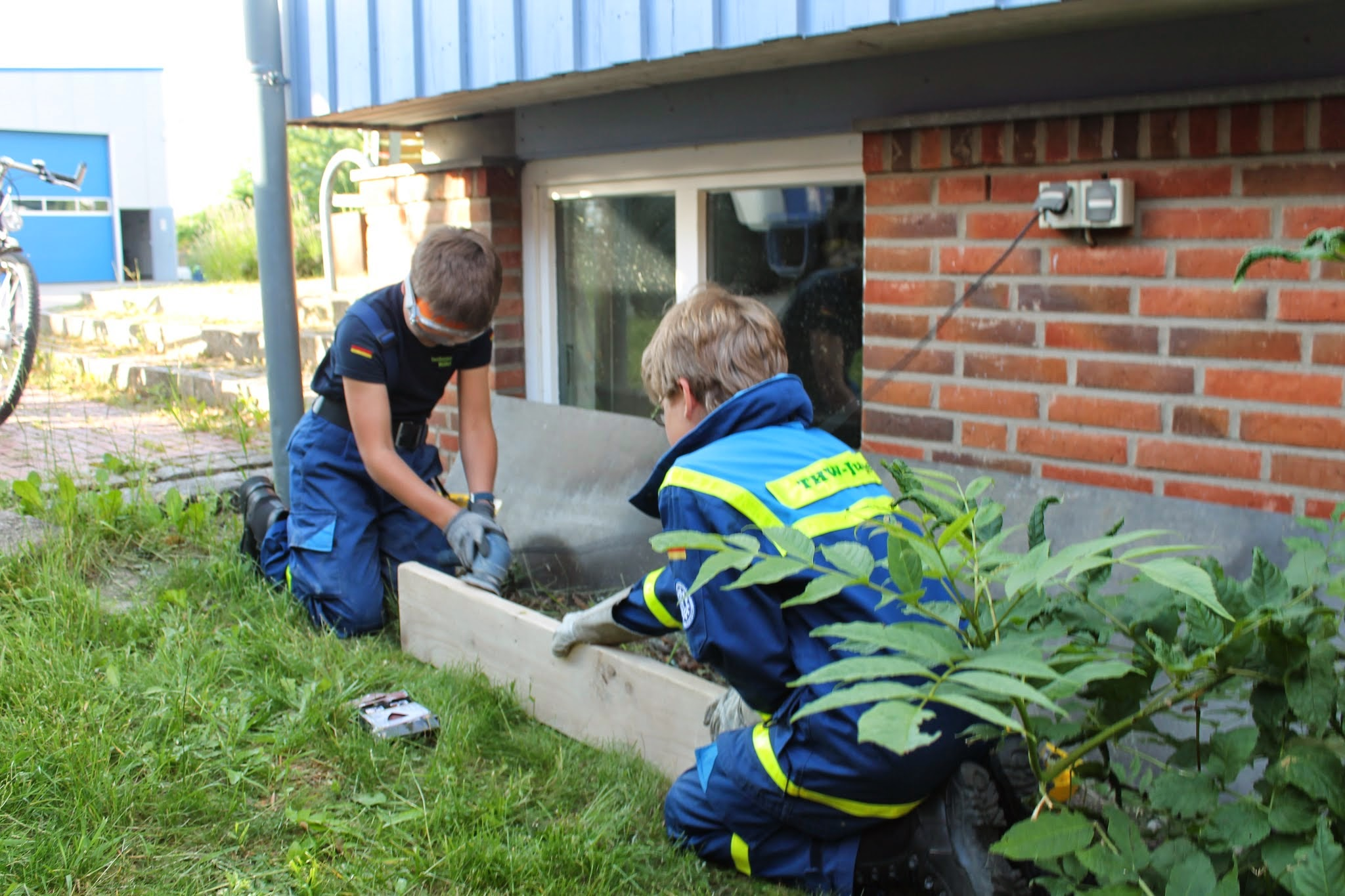 Dazu wurden die Jugendlichen aufgeteilt. Während die eine Gruppe in die Physik und Elektronik eintauchte – es sollte ein Signal geben, damit man weiß, wann und ob jemand den Draht berühre – kümmerte sich die andere Gruppe und das verbiegen und zusammenbasteln des Drahtes. Aufgrund der hohen Dienstbeteiligung fing eine dritte Gruppe an den Bollerwagen umzugestalten. Er sollte von „Unser Norden“ Schriftzug wegkommen und zu einem individuellen zur Oldesloer Jugendgruppe passenden Aussehen kommen. Dafür grundierten wir die zusammensteckbaren Außenteil erstmal mit dem typischen hellblau der Jugend. Nächste Woche werden dann die Einzelheiten gemalt.