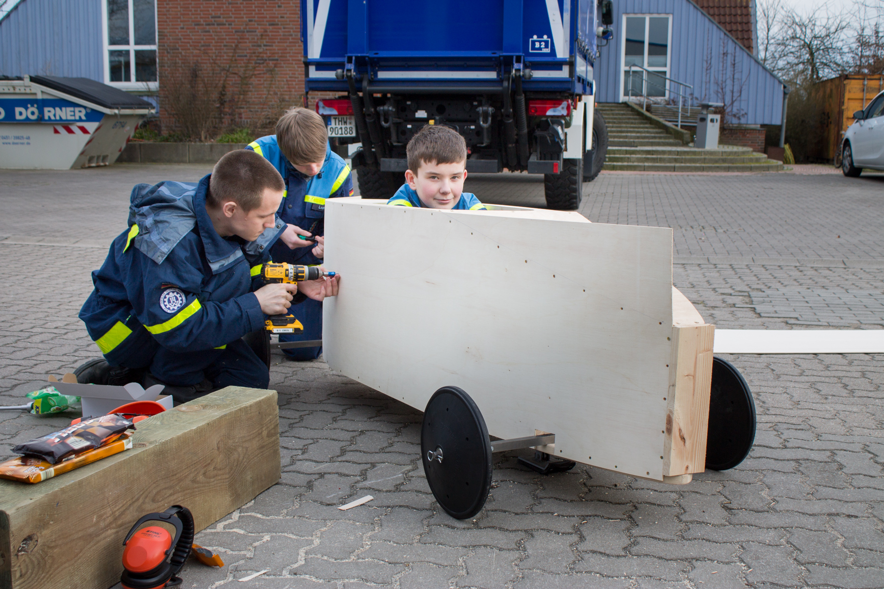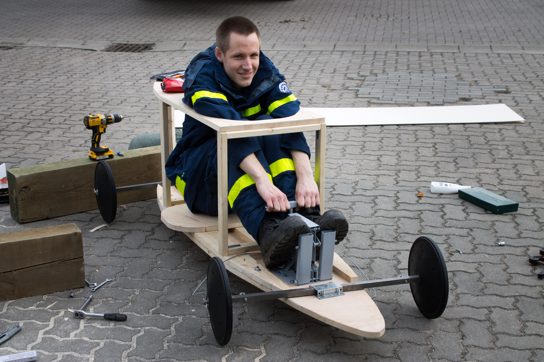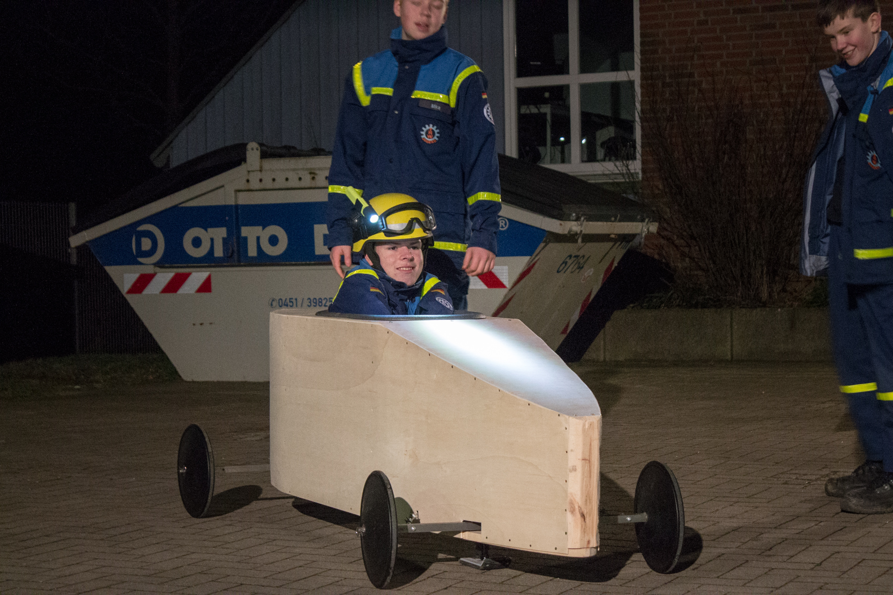 Nachdem am vergangenen Samstagsdienst vor allem die Planung des Baus und die Grundplatte vorbereitet wurde, bei den letzten Mittwochsdiensten einzelne Teile zugesägt wurden, ging es an diesem Samstag an die letzten Feinarbeiten an den Teilen und den Zusammenbau der Seifenkiste. Um 19 Uhr waren dann die letzten Arbeitsschritte vollbracht und es konnte auf unserem Hof die lang ersehnten ersten Testfahrten durchgeführt werden.