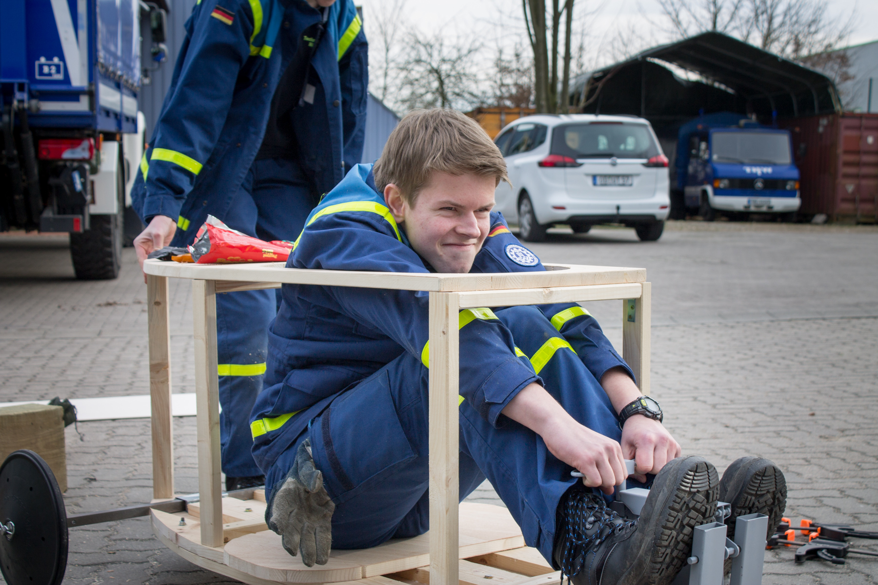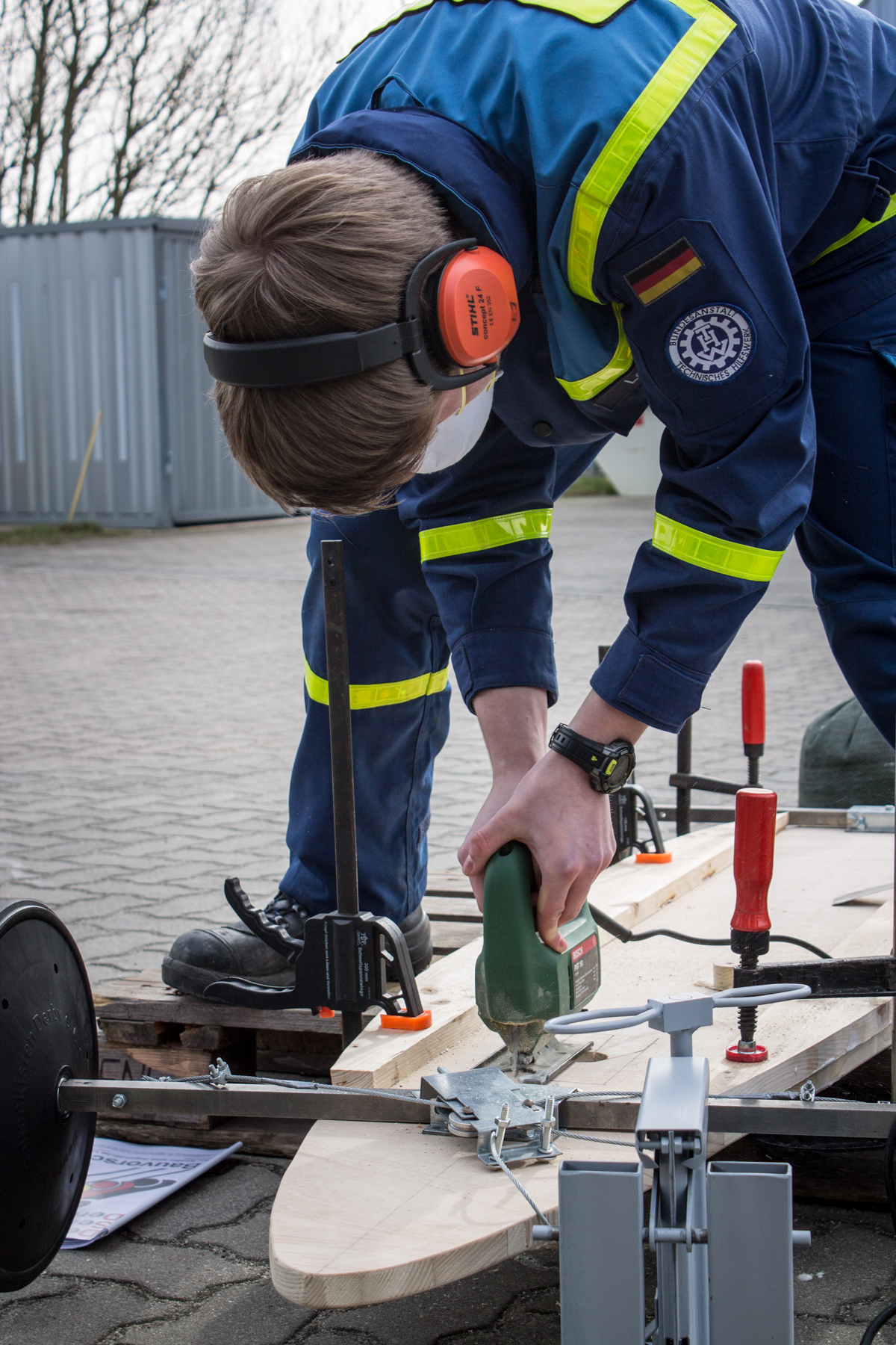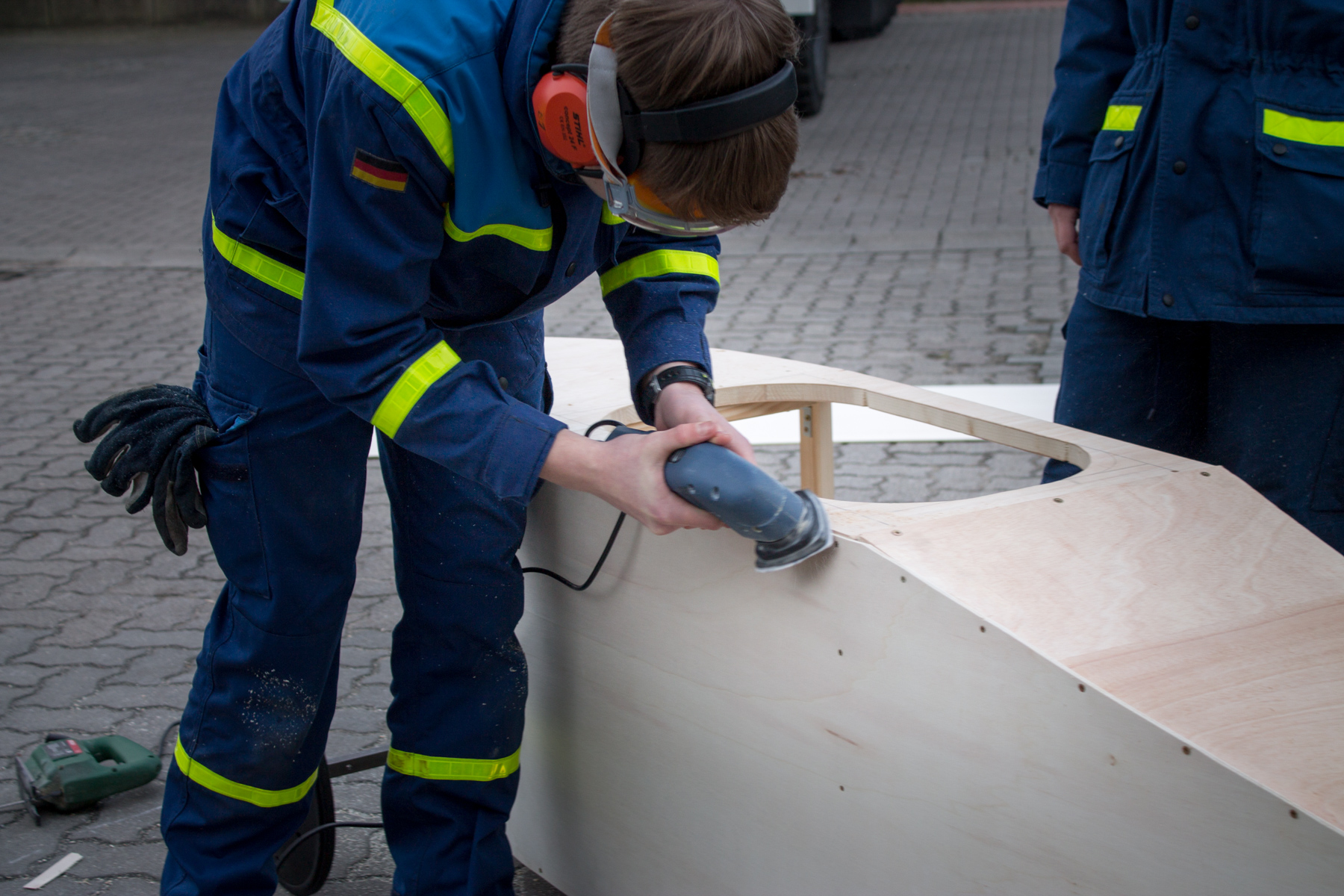 Nachdem am vergangenen Samstagsdienst vor allem die Planung des Baus und die Grundplatte vorbereitet wurde, bei den letzten Mittwochsdiensten einzelne Teile zugesägt wurden, ging es an diesem Samstag an die letzten Feinarbeiten an den Teilen und den Zusammenbau der Seifenkiste. Um 19 Uhr waren dann die letzten Arbeitsschritte vollbracht und es konnte auf unserem Hof die lang ersehnten ersten Testfahrten durchgeführt werden.