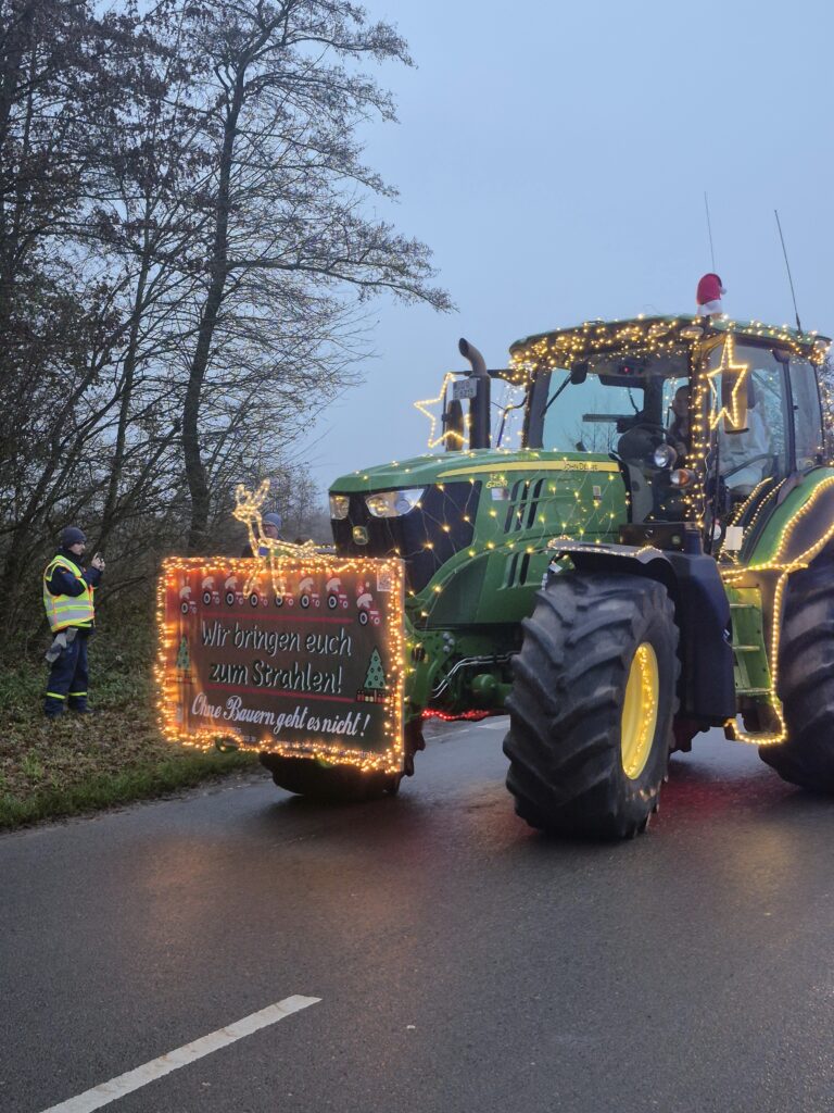 „Wir bringen euch zum Strahlen“ wurde im Jahr 2020 von engagierten Landwirten aus dem Kreis Stormarn ins Leben gerufen. Seitdem schmücken jedes Jahr in der Adventszeit rund 30 bis 35 Traktoren ihre Fahrzeuge mit Lichterketten, Leuchtelementen und liebevoller Dekoration. In einem beeindruckenden, leuchtenden Korso machen sich die Trecker anschließend auf den Weg zu Kinderkrebs-Stationen, insbesondere zum Universitätsklinikum Schleswig-Holstein (UKSH) in Lübeck sowie zum Universitätsklinikum Hamburg-Eppendorf (UKE). Ziel der Aktion ist es, den erkrankten Kindern, ihren Familien und dem Klinikpersonal ein Lächeln ins Gesicht zu zaubern und für einen Moment Freude und Abwechslung in den Alltag zu bringen.
